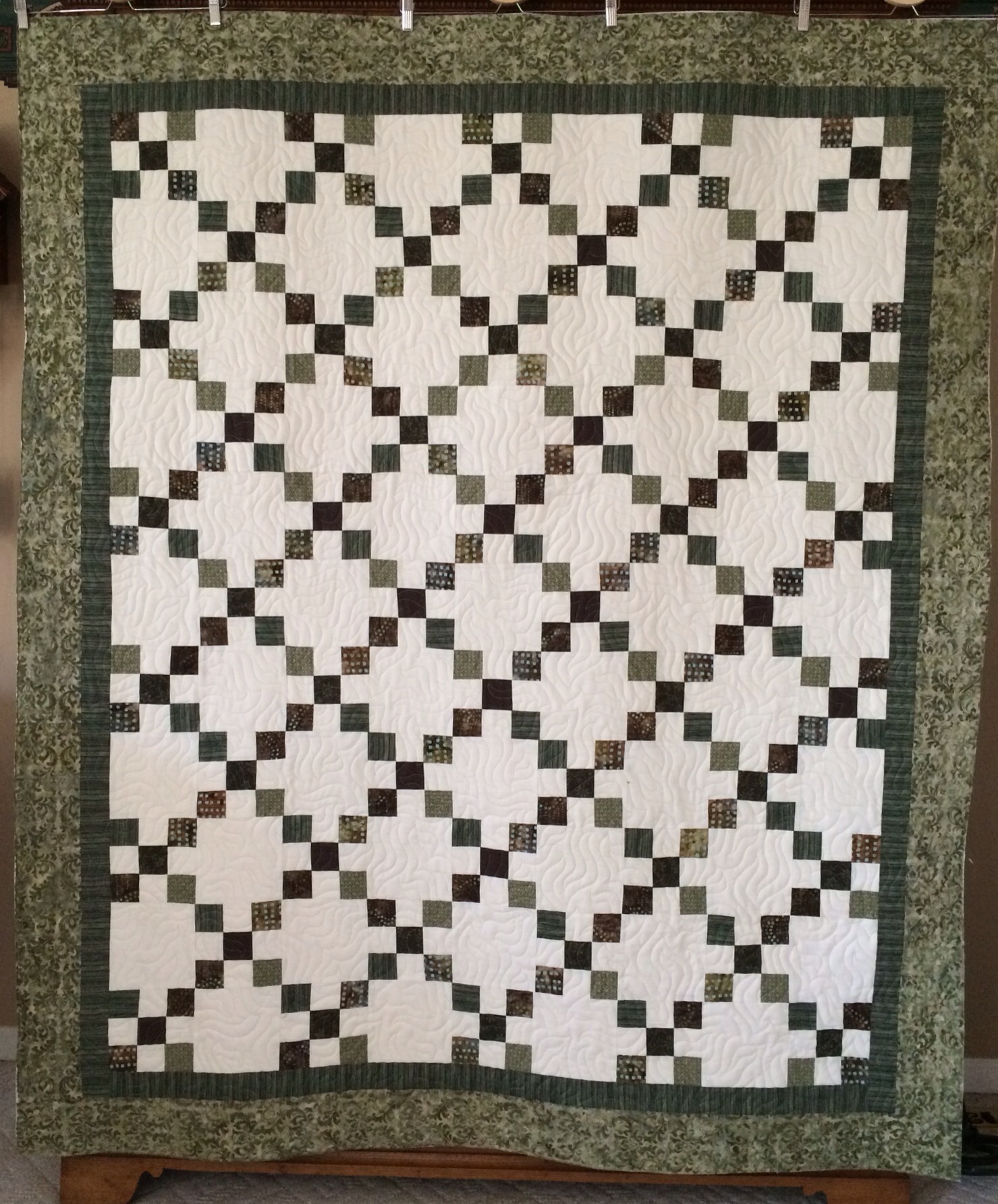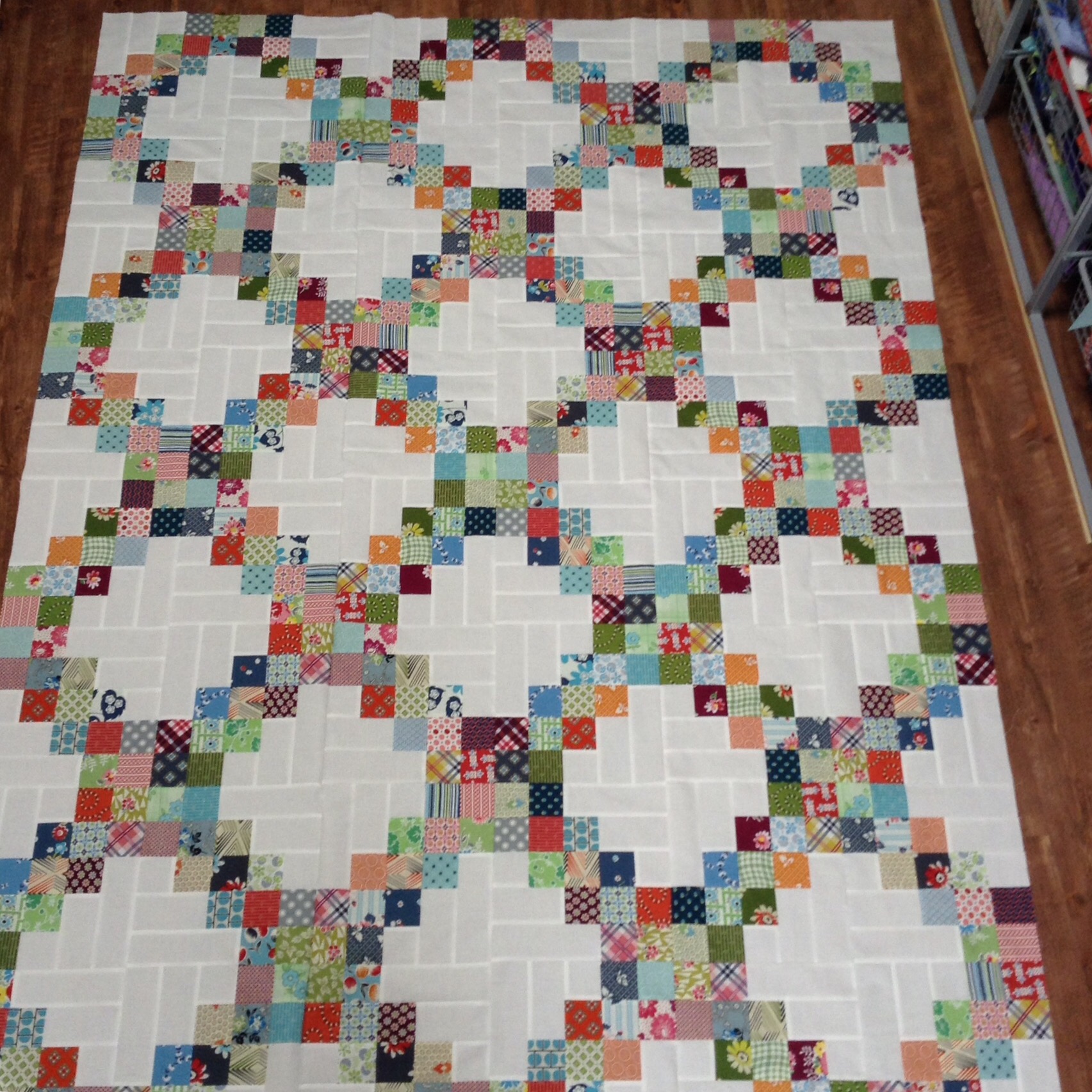 4. I am going to make a quilt for each of my sisters this summer. I have fabric for both but need to make some decisions on designs. I want to have at least one of them to the piecing stage this month. The top for the first one is now done! Here is a picture taken before the borders were added.