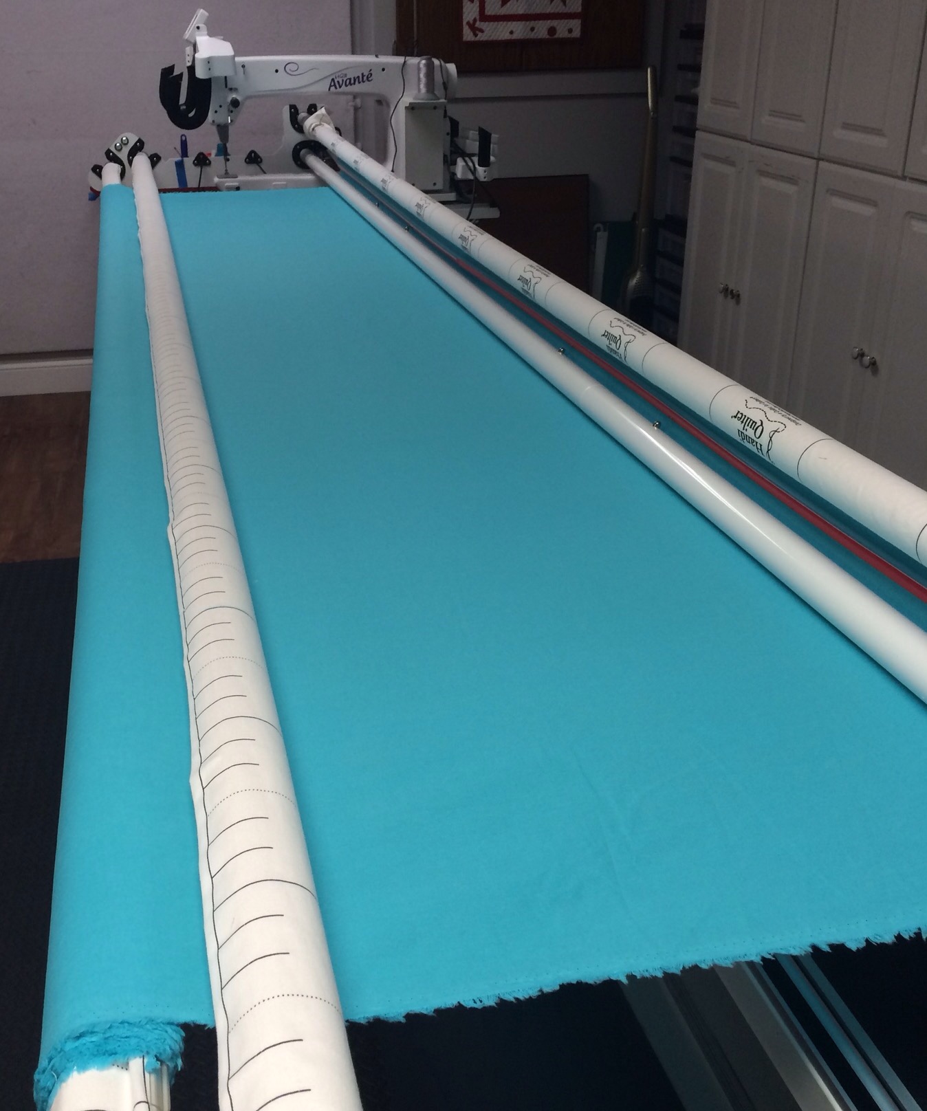 I think it looks pretty good with the border fabric. And with my coupon, it was only $5 a yard. Not bad for 108 inch wide backing. And I won’t be running short this time! I even got it loaded onto the frame.