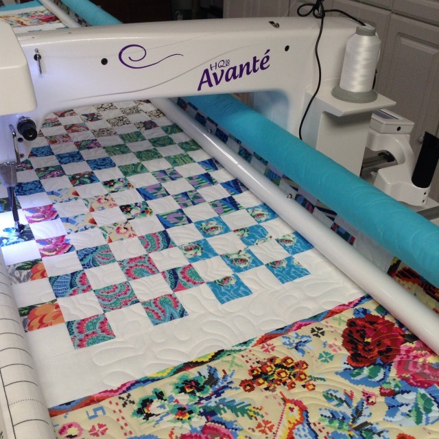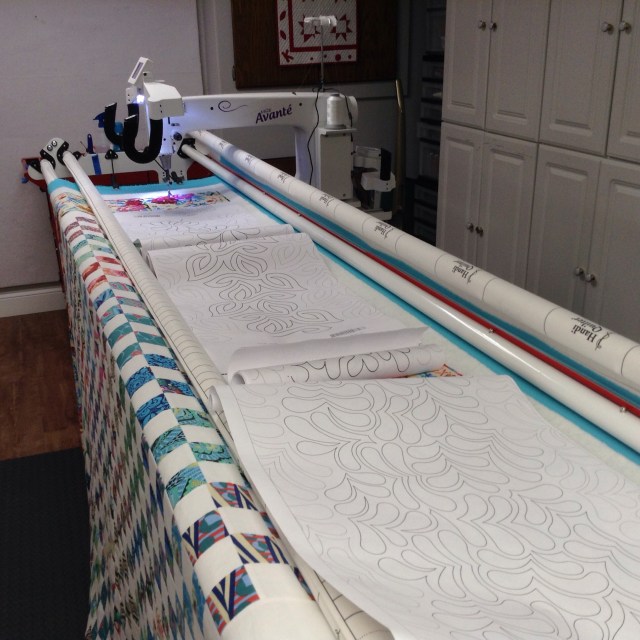 Each row of quilting takes approximately 35 minutes to stitch. This is time the machine is actually running. It does not include the time it takes to change bobbins, advance the quilt, align the pattern etc. This will be ready to bind before I leave this week but I may save that job until I get my Bernina back from the shop. I really like that machine for bindings.