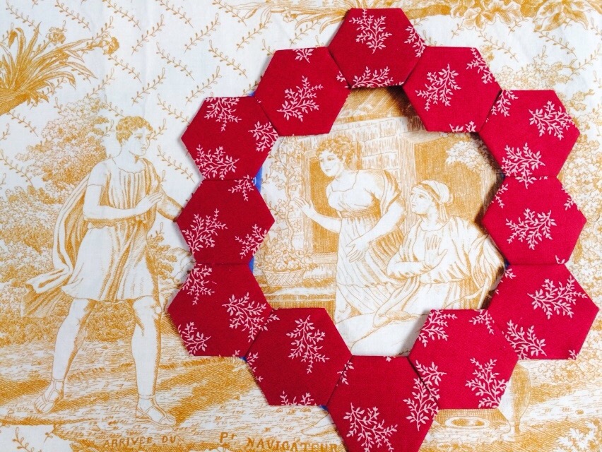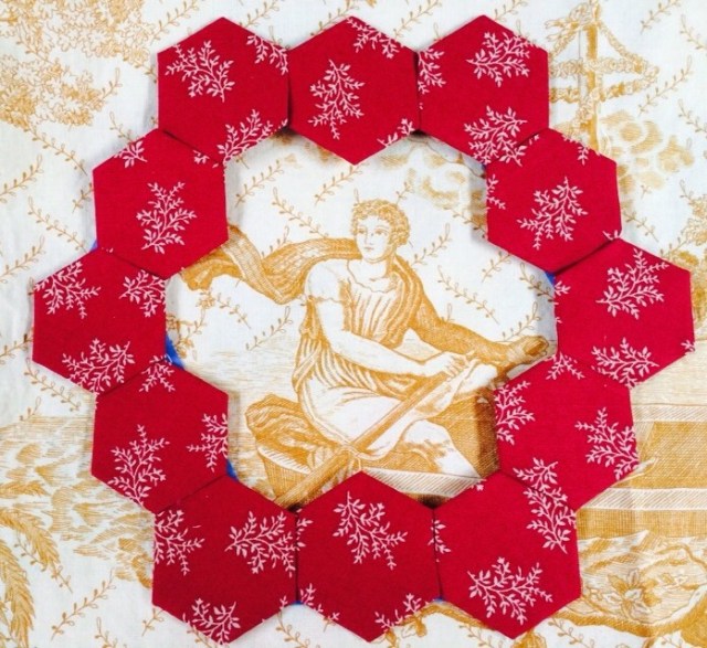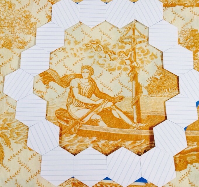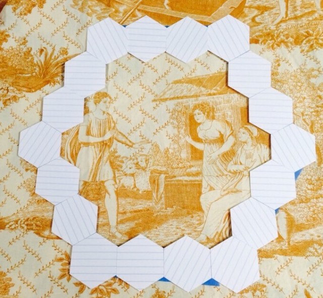 On Tuesday I showed you the EPP project I was looking at from Quiltmania. I decided to see how it would work if I made smaller hexie frames like this.