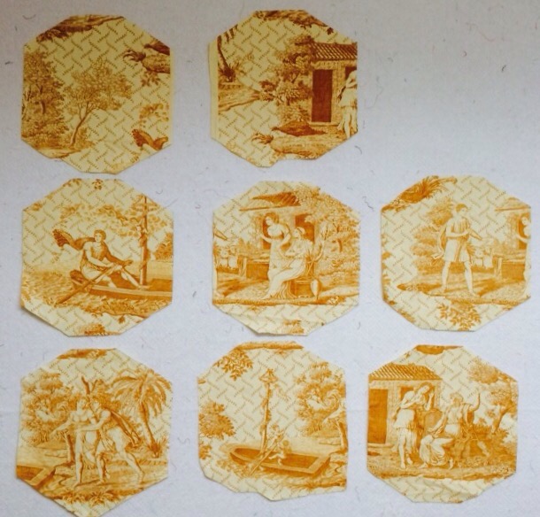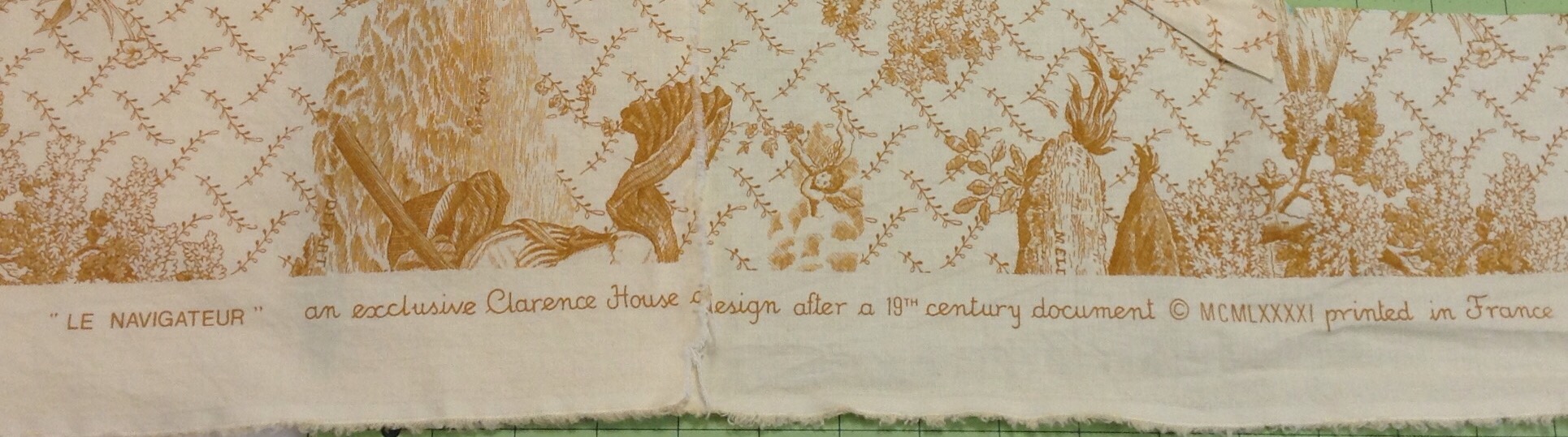 Yep, that’s better. The pattern called for 10 inch squares of the background to be cut and then these frames would be appliqued on top and the excess cut away. I trimmed mine a bit closer to the actual size needed. I don’t have any of this fabric to waste. I will never be able to get more since I bought it 16 years ago in France. Check out the selvedge.