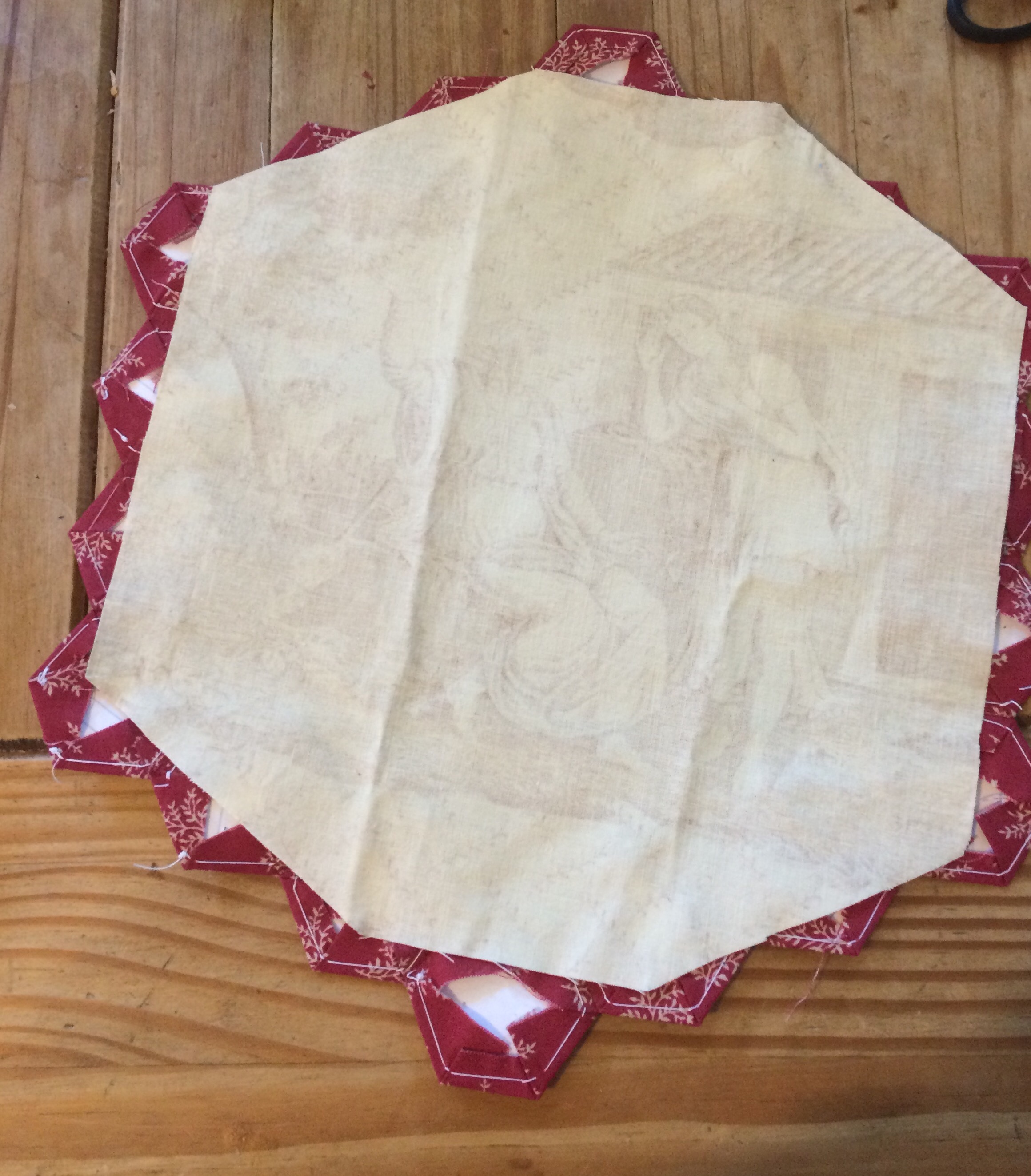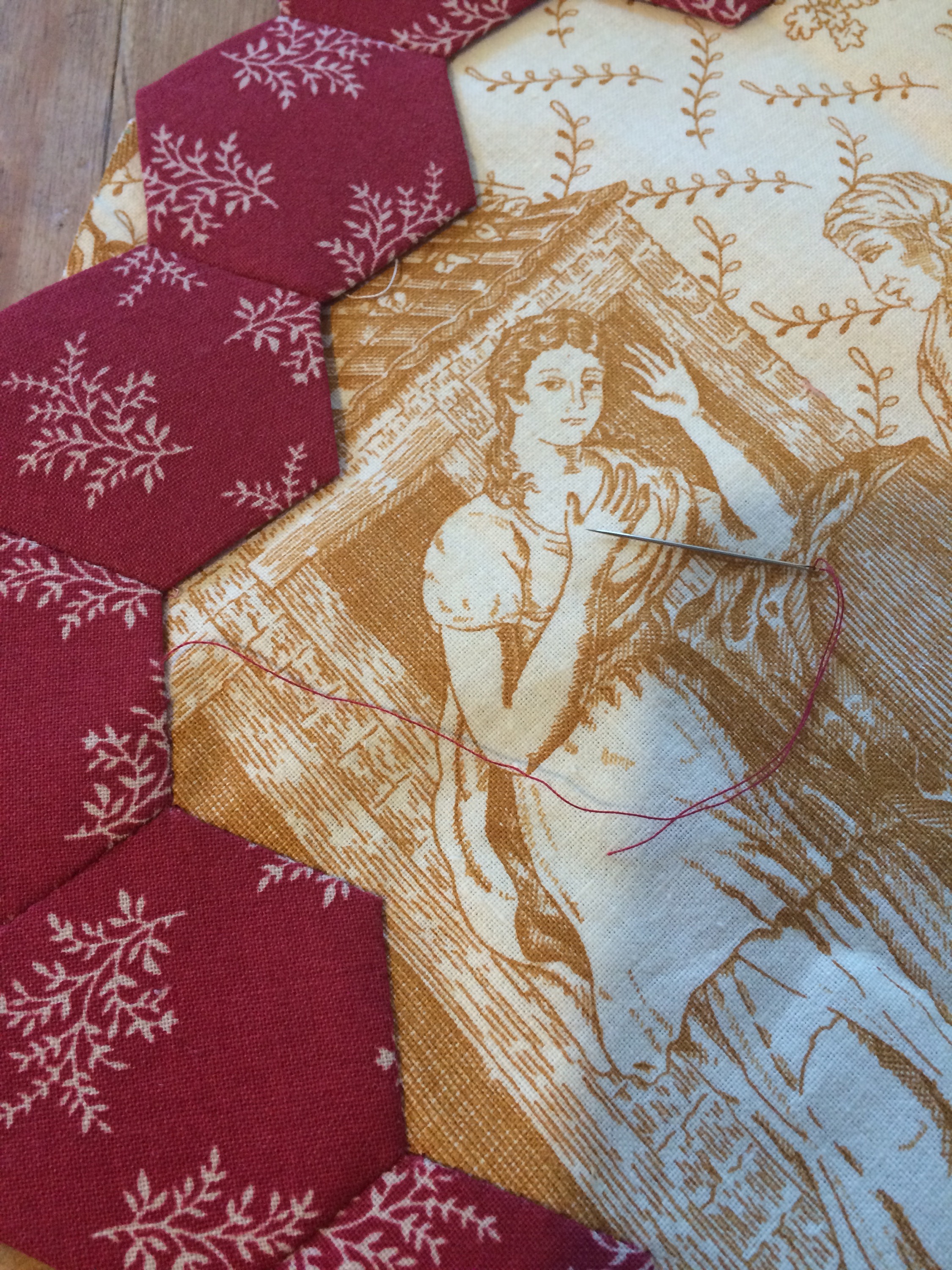 I’ve made a wee bit of progress on my EPP project. I finished the red ring and begun appliquéing it to its center.