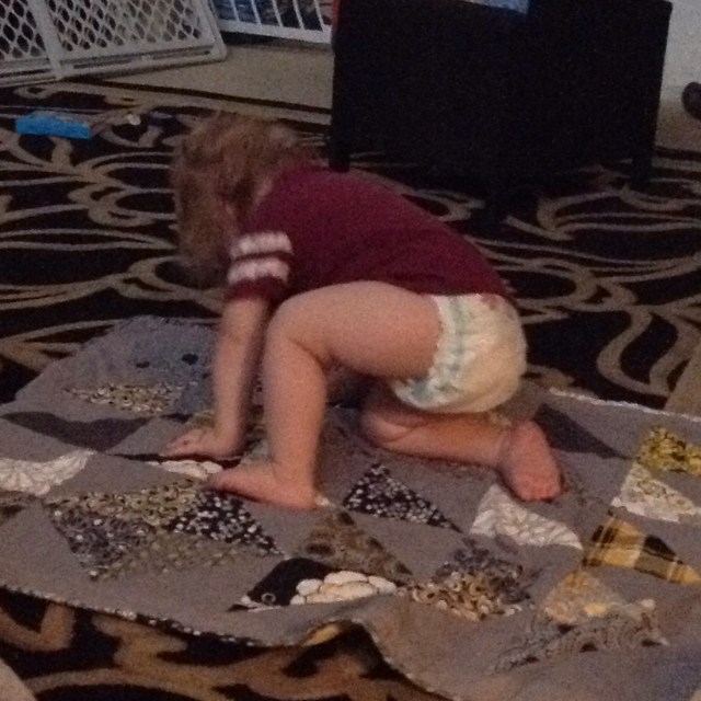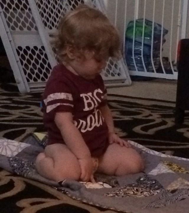 Big brother thoroughly inspected the quilt and decided it should belong to him!