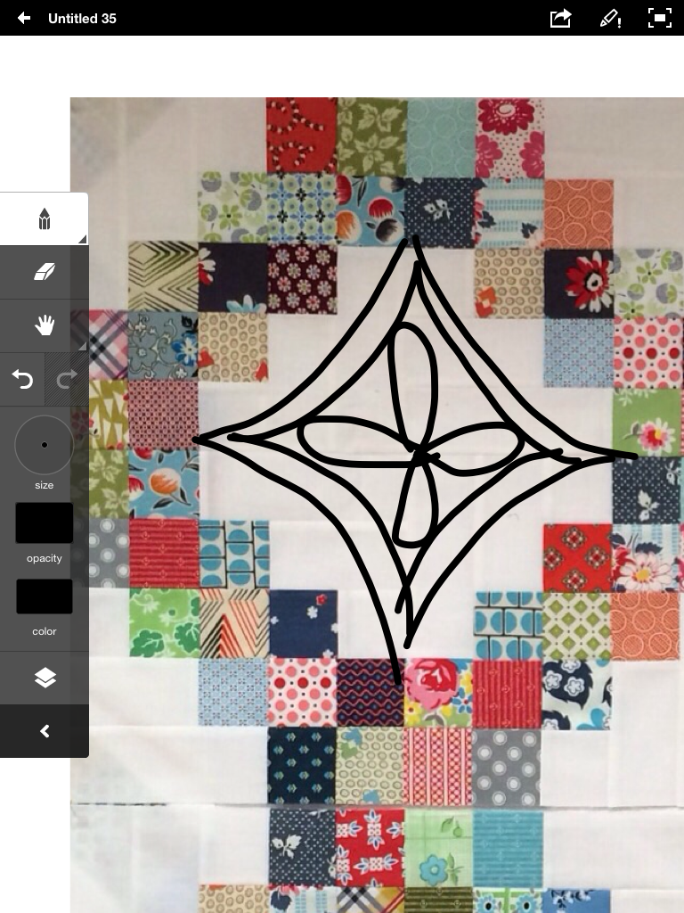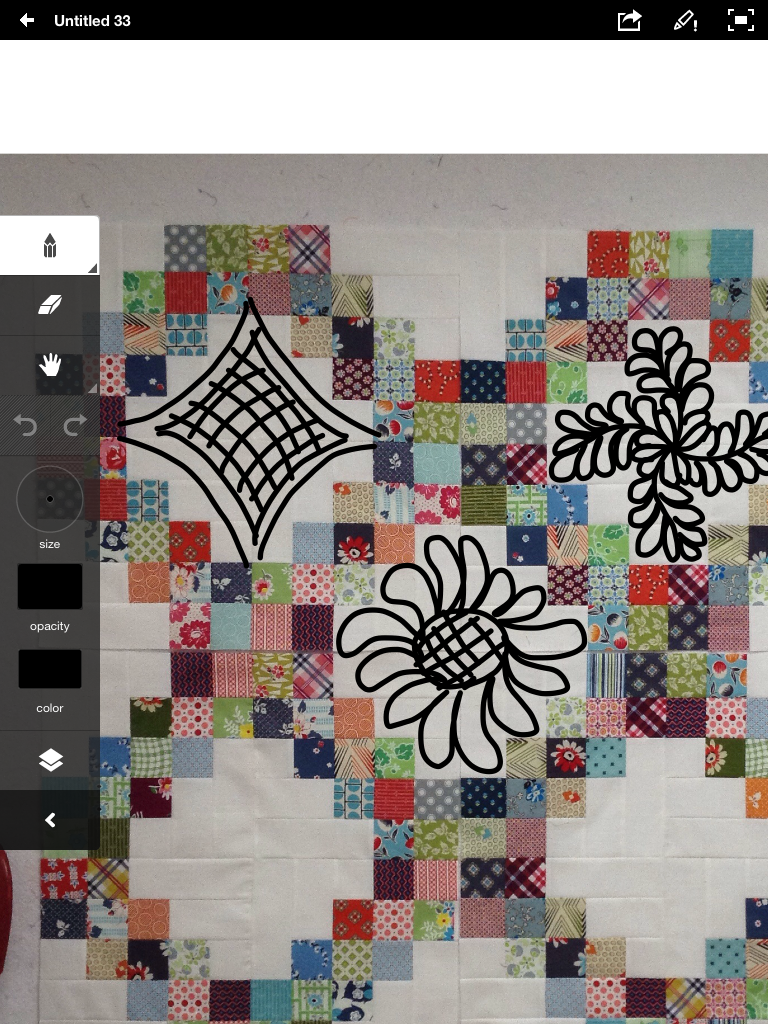 You are basically drawing with your finger tip with this app. And clearly, I am not good a that! But it does help to visualize the quilting.
