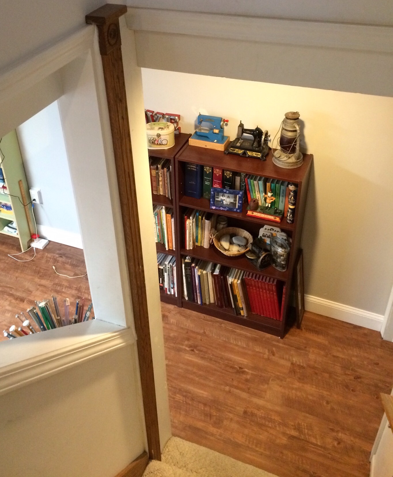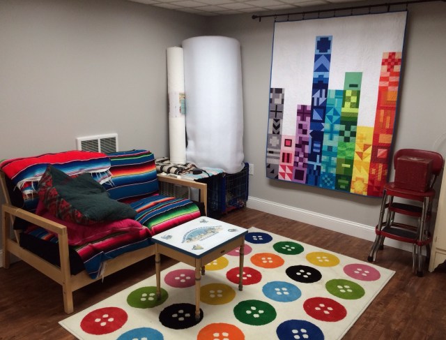 This corner belongs to the dogs, literally. You see their crates underneath those two rolls of batting. And that love seat? It belongs to the dogs too. No one else sits there.