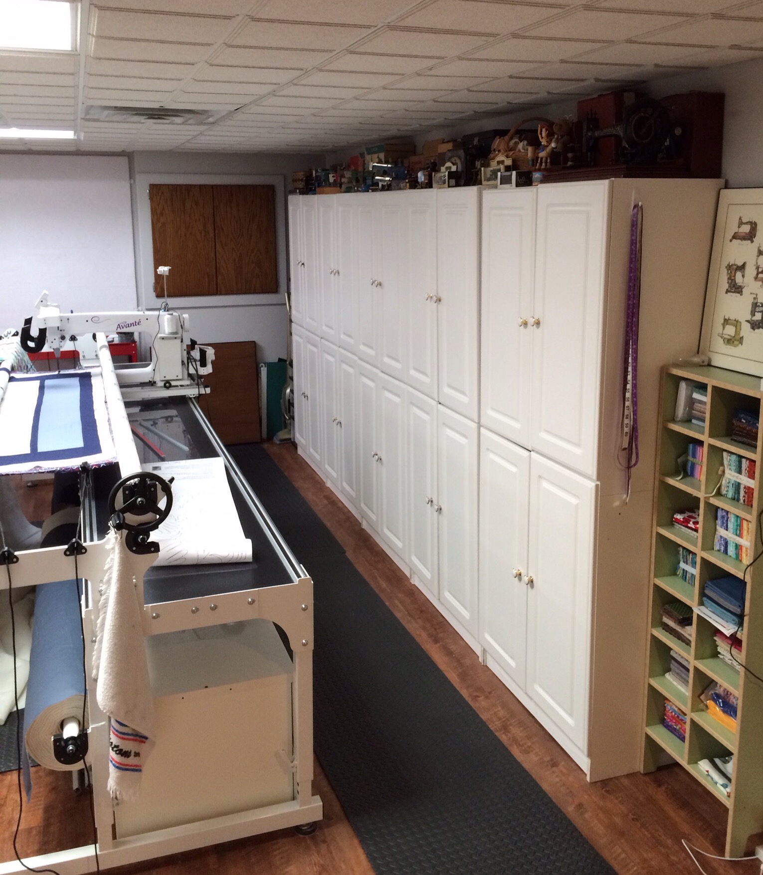 I will walk you around the room moving to the left. The first things you see are my white storage cabinets. These things have traveled to France and back! We used them when we lived there in the late 90s for bathroom and kitchen storage. Now I get them all for sewing stuff! They hold long arm bits, books, vintage sewing machine attachments, my serger, craft supplies, etc. In front of those, you see my favorite machine EVER! My HQ Avante long arm.