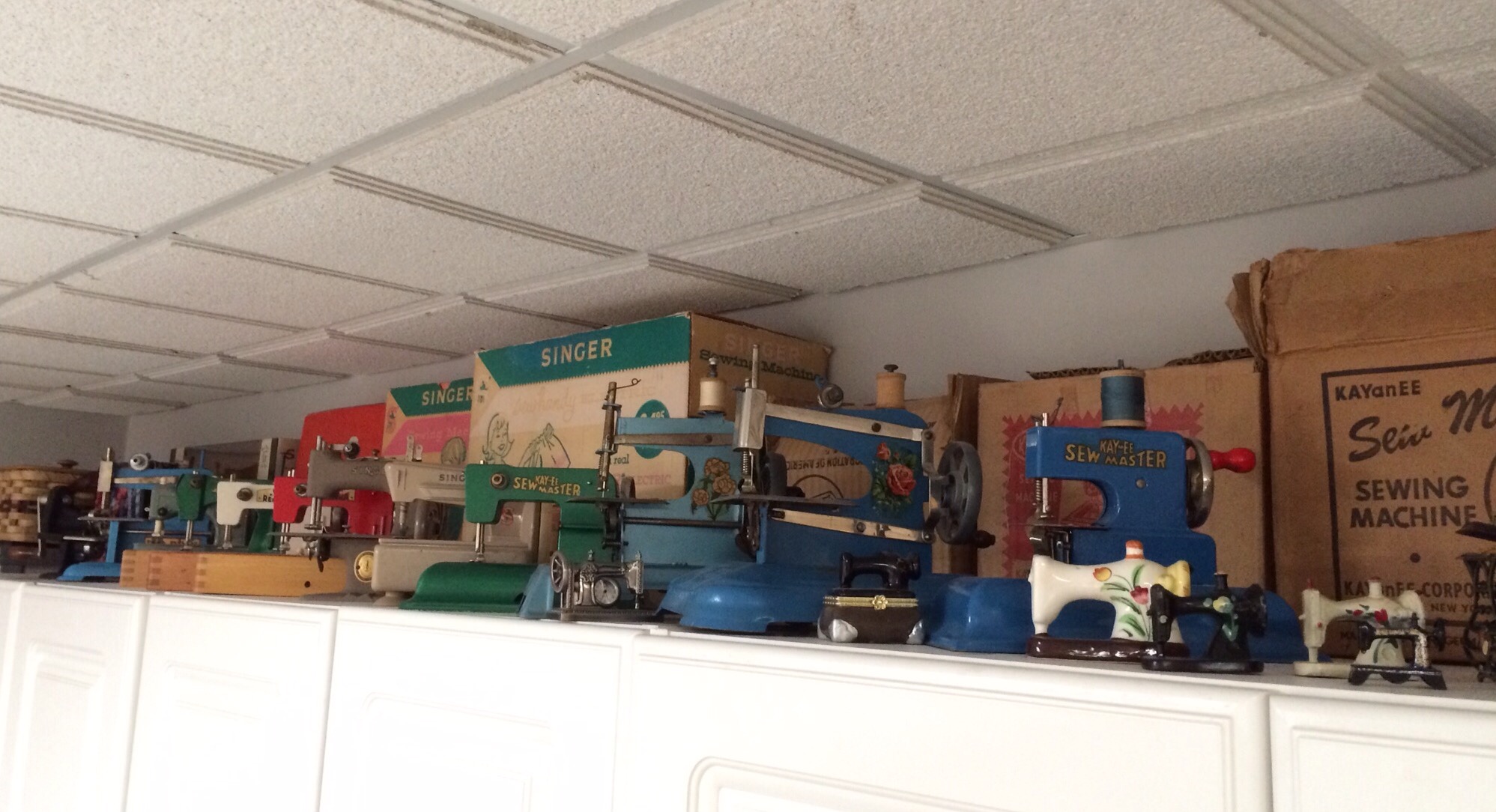 My vintage toy sewing machine collection lives happily on top of my white cabinets.