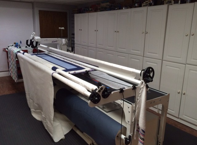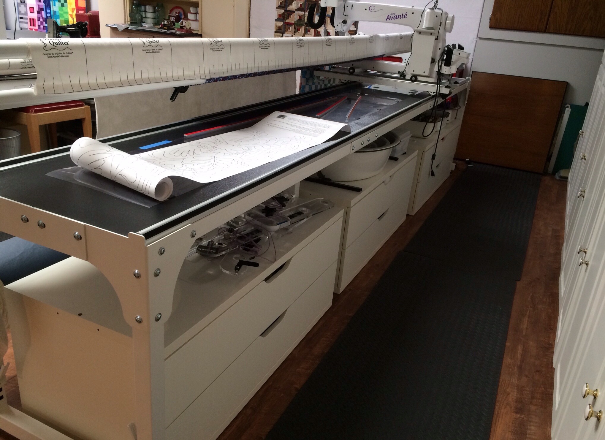 Beneath the long arm, I have these Ikea Stolmen cabinets. They were intended to be part of a closet organizing system but they fit perfectly between the supports of my frame. I use these to store quilts that I have quilted, quilt tops waiting to be quilted, large pieces of fabric for backings, and my pantographs.