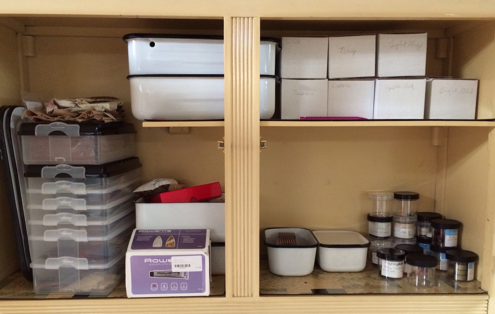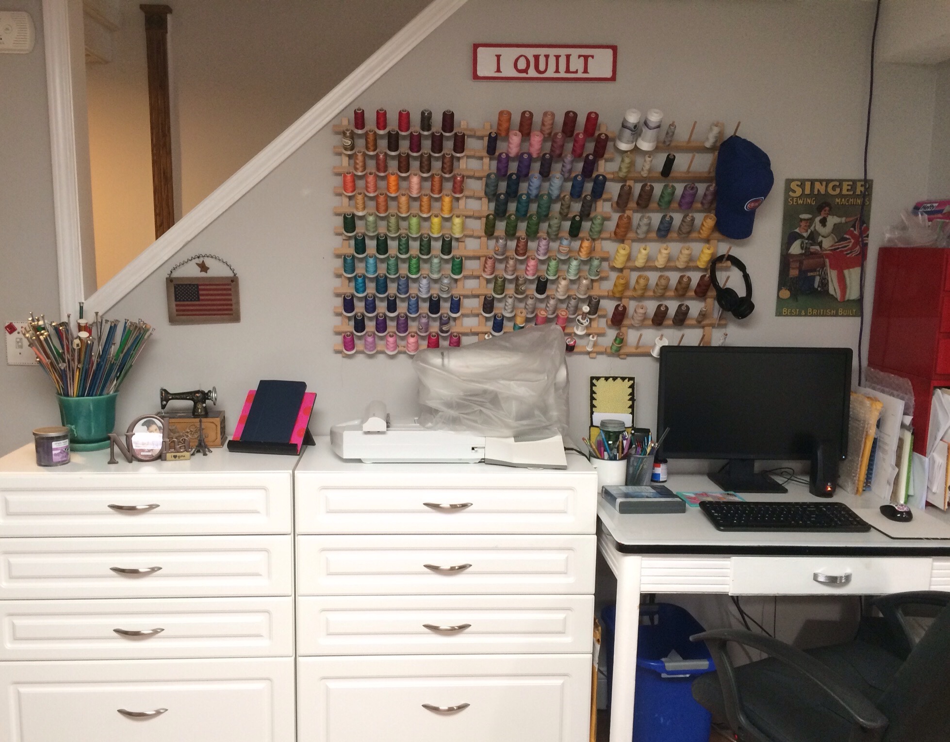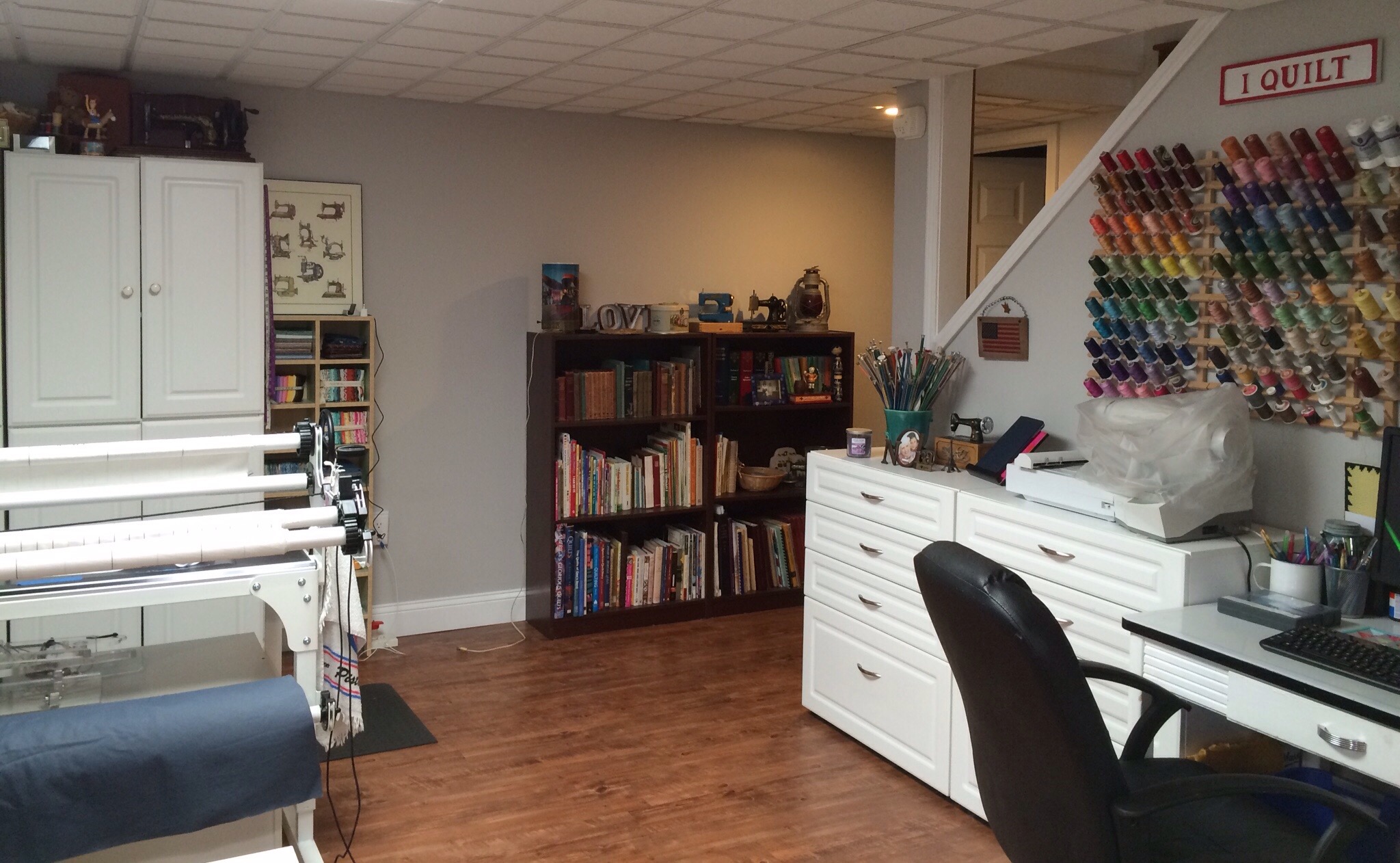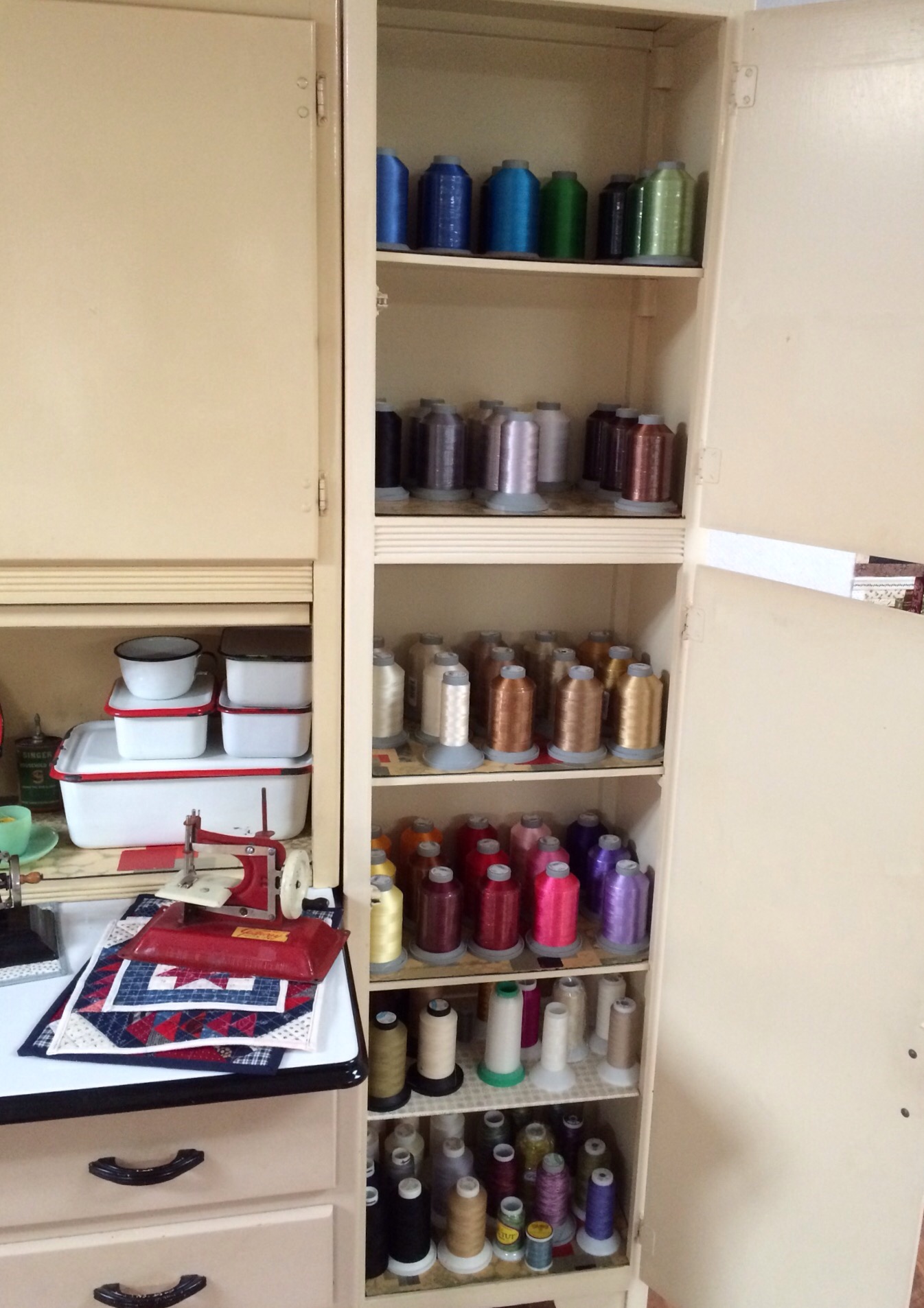 Want to take a peek inside? The cabinet on the right is where I store my long arm thread.