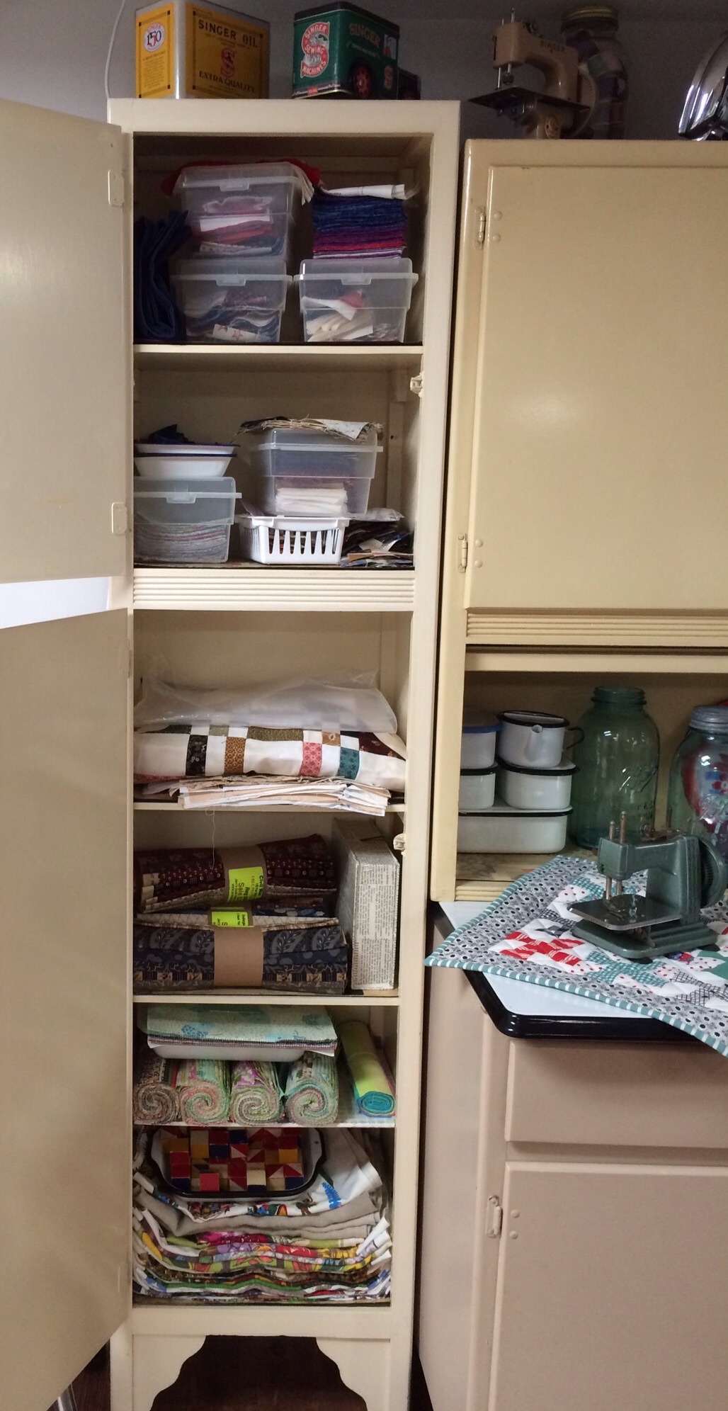 The cabinet on the left holds sets of finished blocks, more precut pieces, my vintage tea towels, fat quarter bundles, and layer cakes.