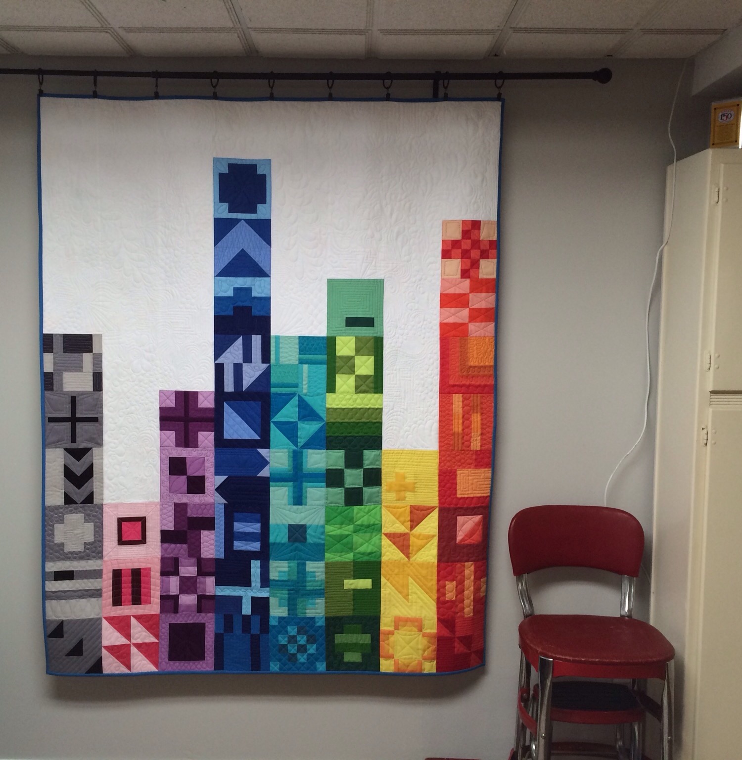 Moving to the left again you can see the curtain rod my hubby put up for me to hang quilts on. I use café style rings with clips to hang the quilts. This makes it really easy to change out the quilts on display. My vintage step stool comes in handy since I can’t reach the top of my design wall without it!