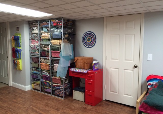 As with most sewing rooms, this is and always will be, a work in progress. As I find things that are not working for me, I work toward a solution. For example, I used to have the die cutter and my Featherweight table switched around but I like to pull out one of the table leaves and I felt squashed between the table and the long arm. Trading spaces for these two items solved the problem. I only wonder why it took me so long! I also find that while I am working, I am often shifting piles from place to place. I decided that I have the space to add another table in front of my wire basket system so I have room to set baskets while sorting through them as well as a space off to the side to keep my cutting table clear. The hunt is on for the perfect piece to meet this “need.”