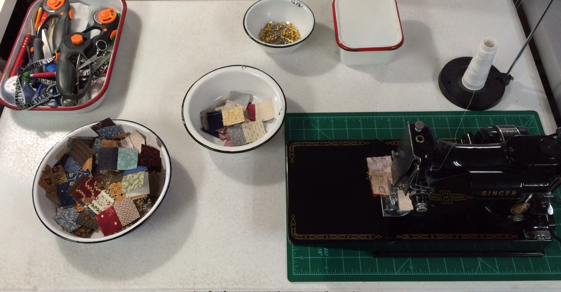 Here is a look at the stuff on the table top. I have a container of scissors, pencils, cutters, rippers etc. Pins in another container, bobbins in another, and my leader ender projects in the bowls.
