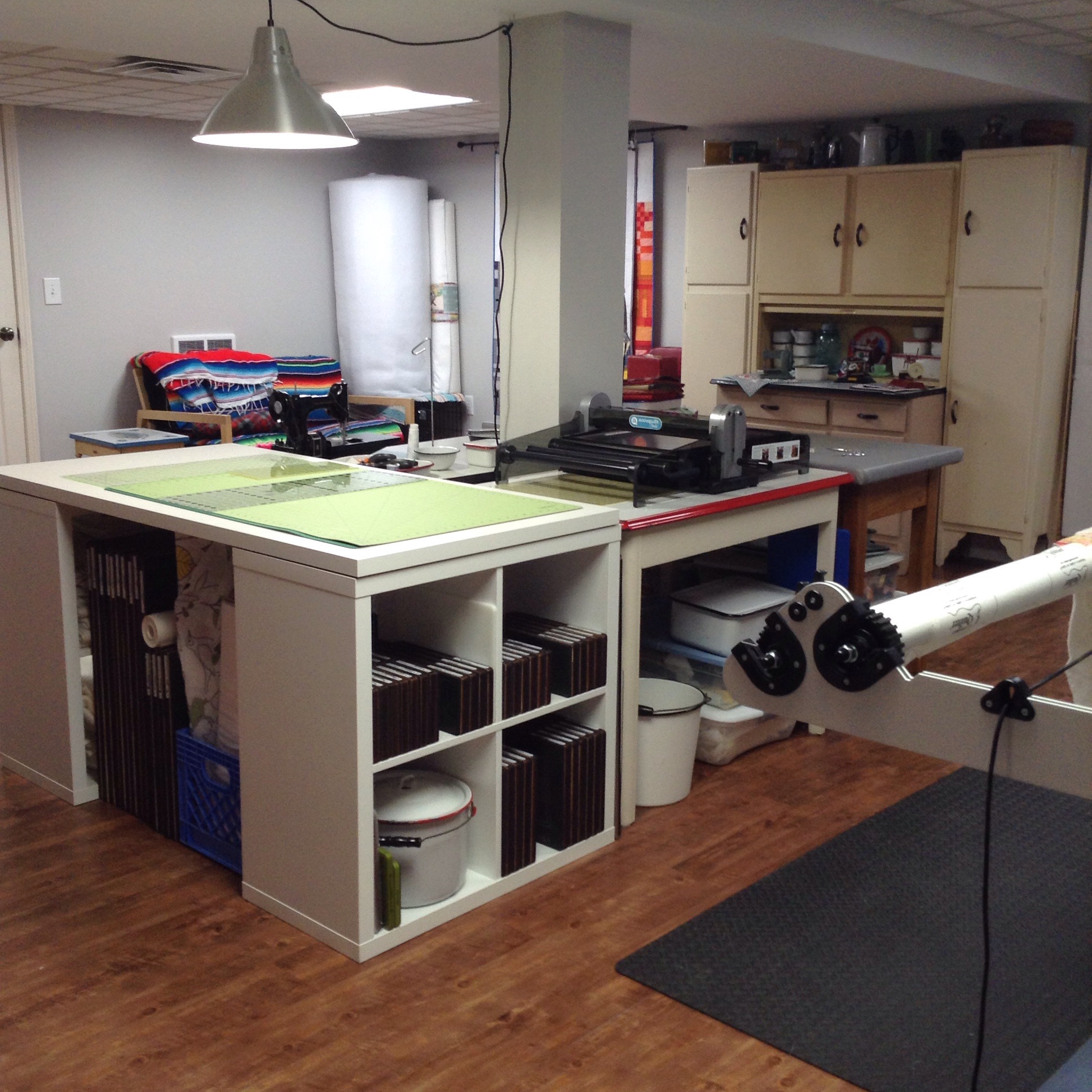 Love the cabinets behind the longarm…lots of storage. I have got to get me some of these (taken from the movie “Independence Day”) 😀 Also, love the way you utilized the center of the room around the support posts…very clever!