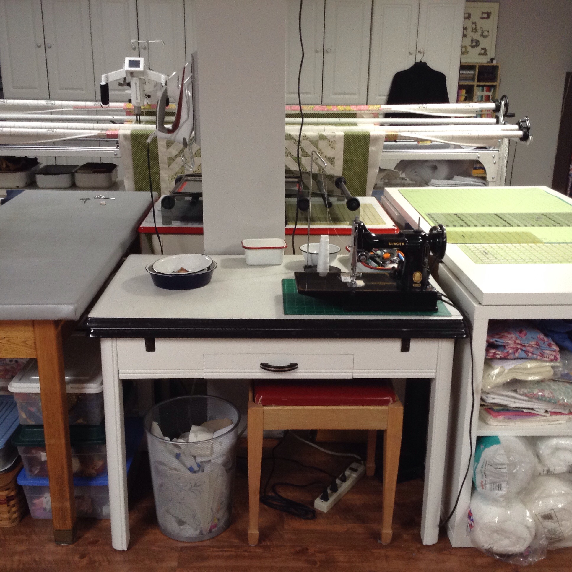 The other vintage table holds my daily driver machine, one of my Singer Featherweights. I do most of my piecing here.