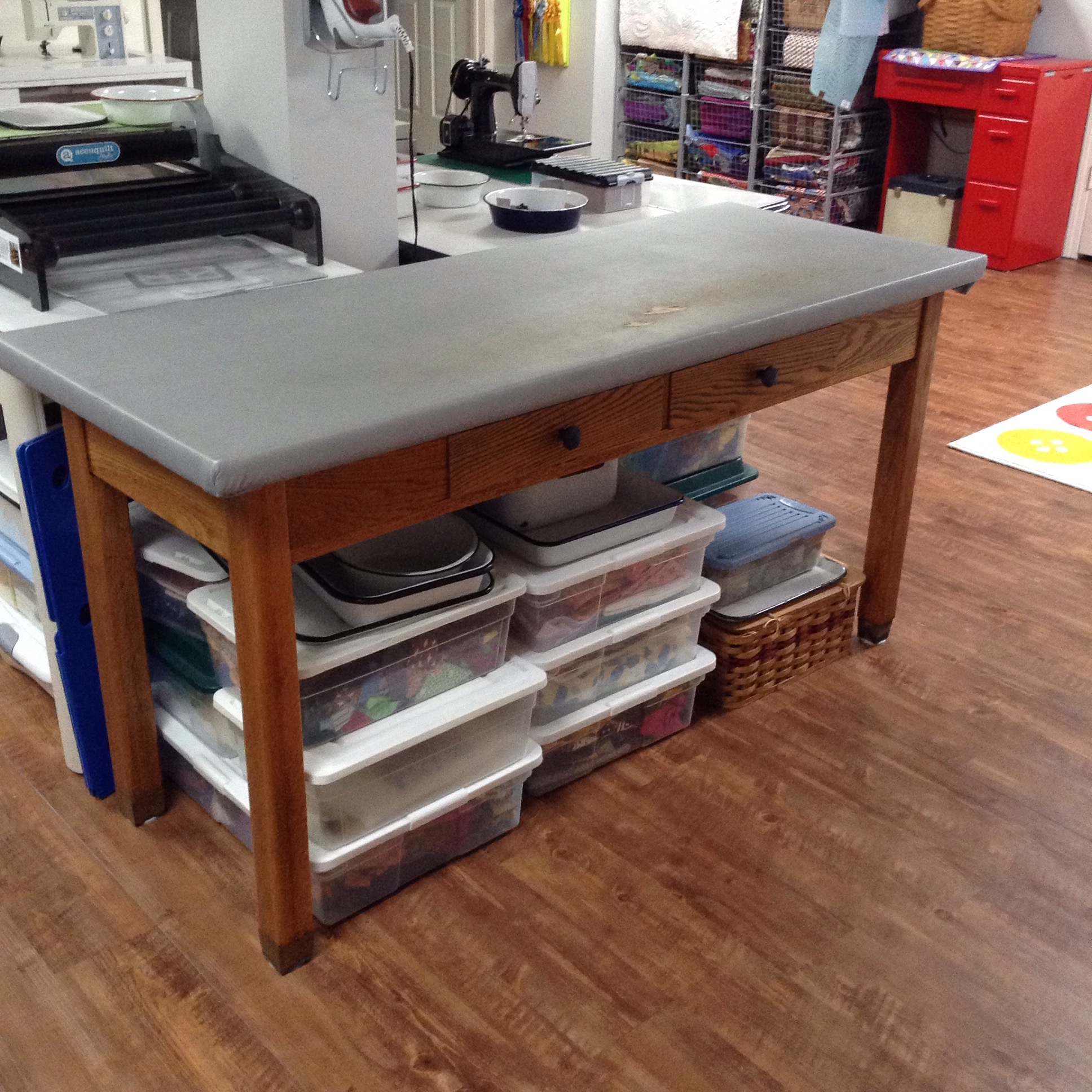 In the center of this room is a support column. Thankfully, it has an electrical outlet in it. I wanted a work island and since I couldn’t move the column, I had to work around it. I surrounded the column with a cutting table, two vintage enamel tables, and an ironing table made from an old high school lab table.