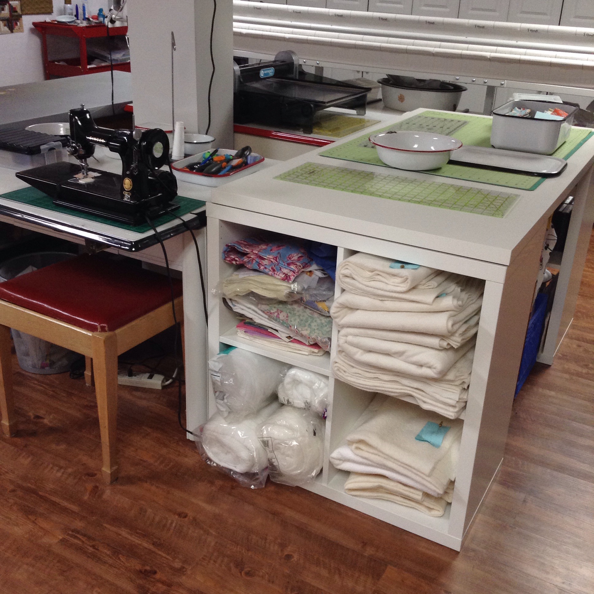 The cutting table was made from two Expedit cabinets from Ikea with a 30 by 60 inch table top set on top. I have my long strip cutting dies and bolts of fabric under it.