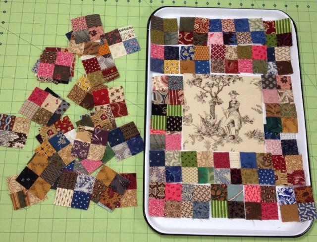 Visiting from Let’s Bee Social. Love your “George”. If you tea dyed your charm squares, would it bring the brightness of the fabric more in line with your center square?
