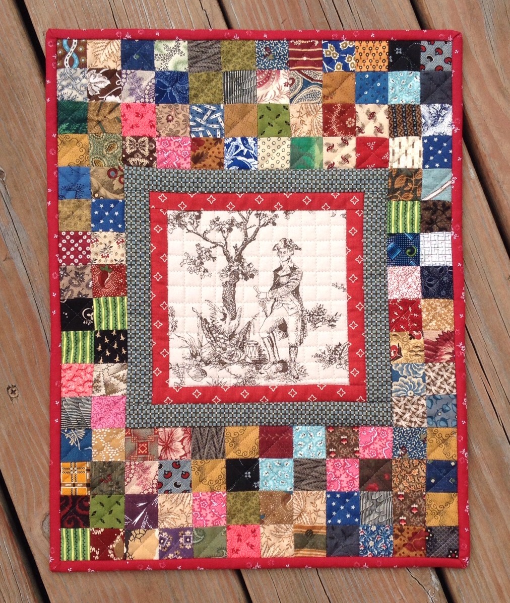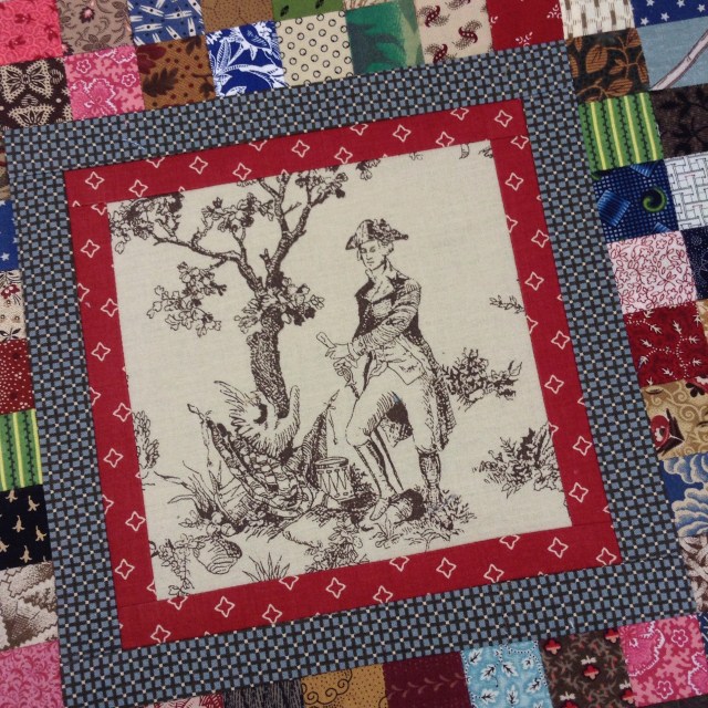 My next finish is at the other extreme stylewise…remember how I mentioned that I was inspired by a little quilt I saw over at Humble Quilts? I found this bit of toile and used it to make my little George quilt.