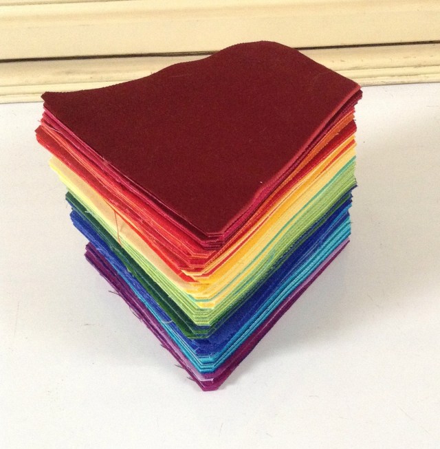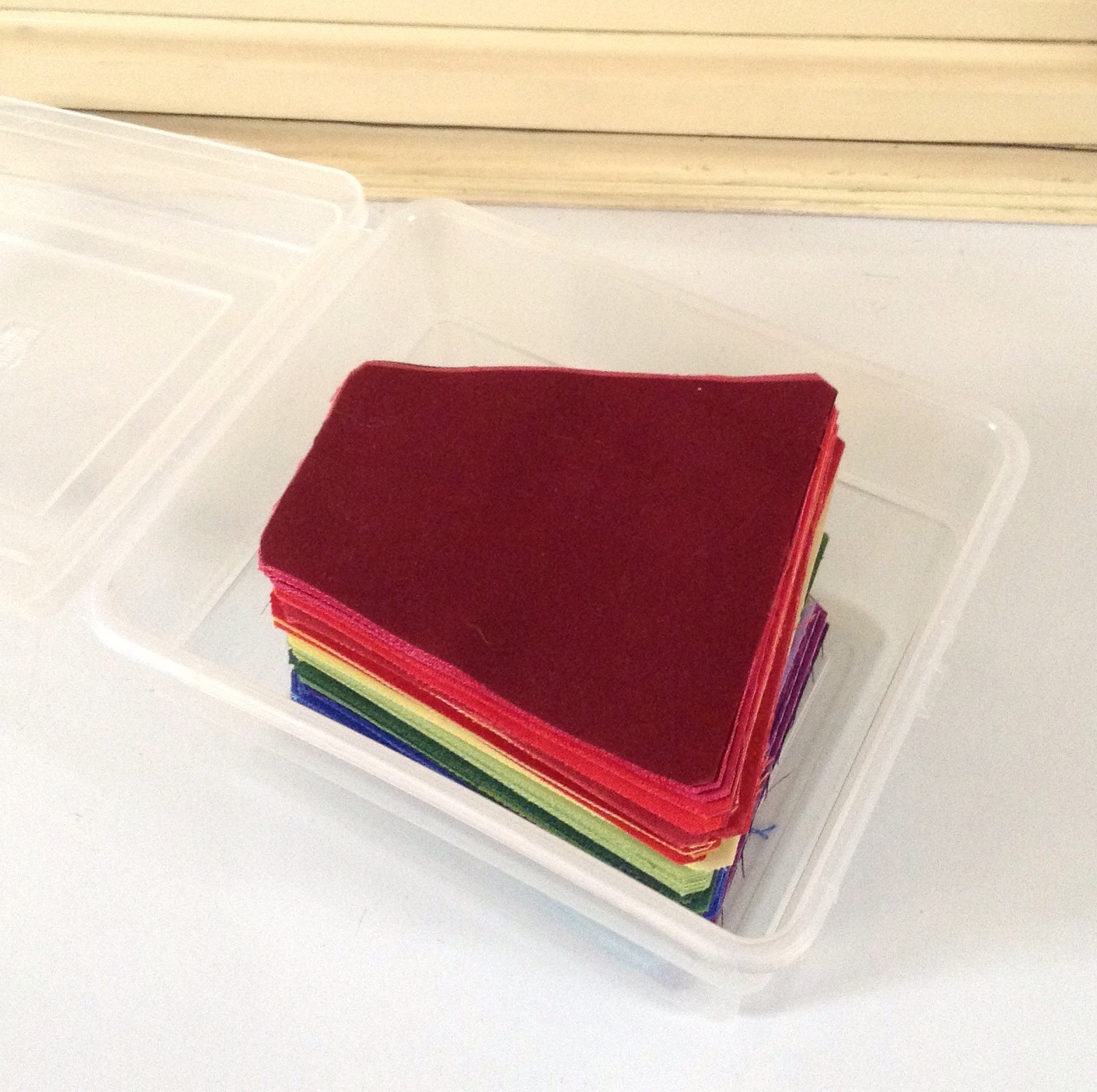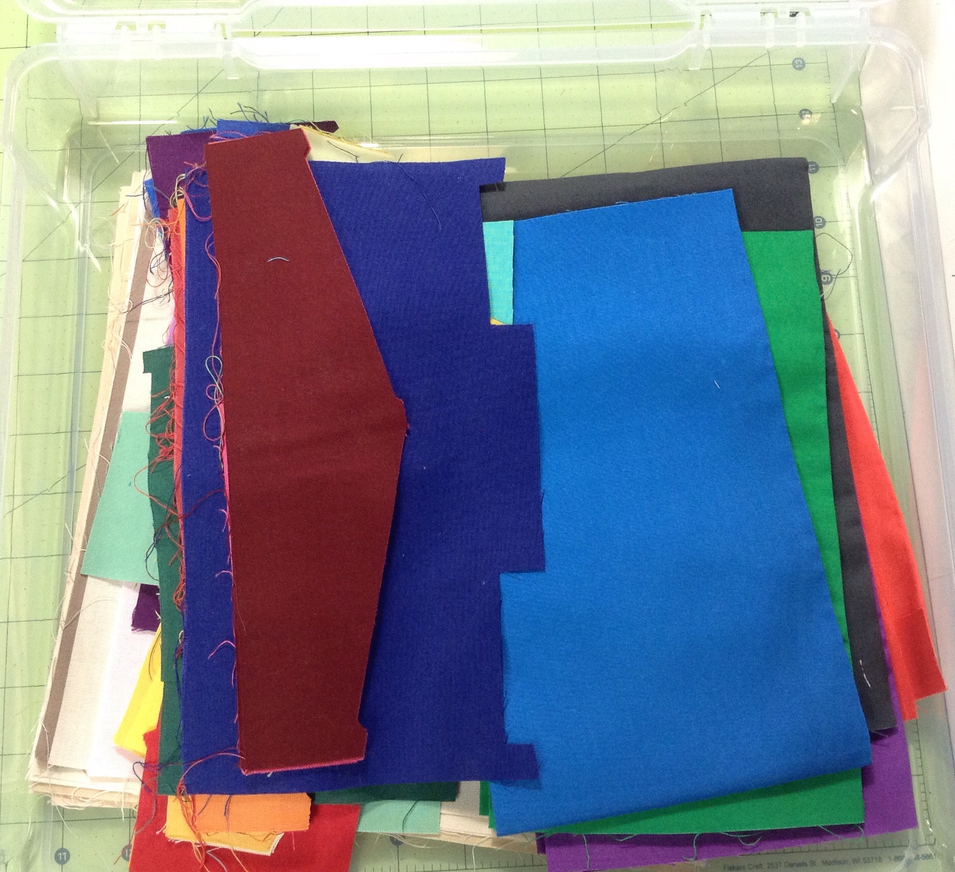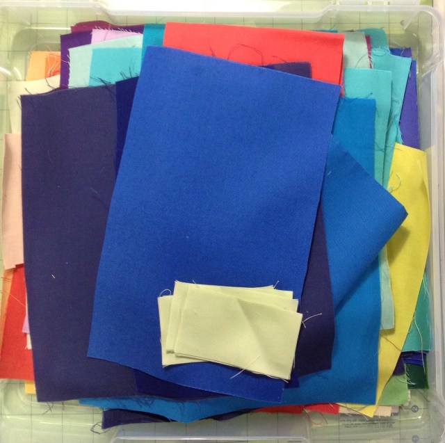 I still have some pastel squares in this box but I didn’t want to mix them in with these mostly brights. I also had a couple larger bits leftover from fat quarters so this is how the bin looks now.