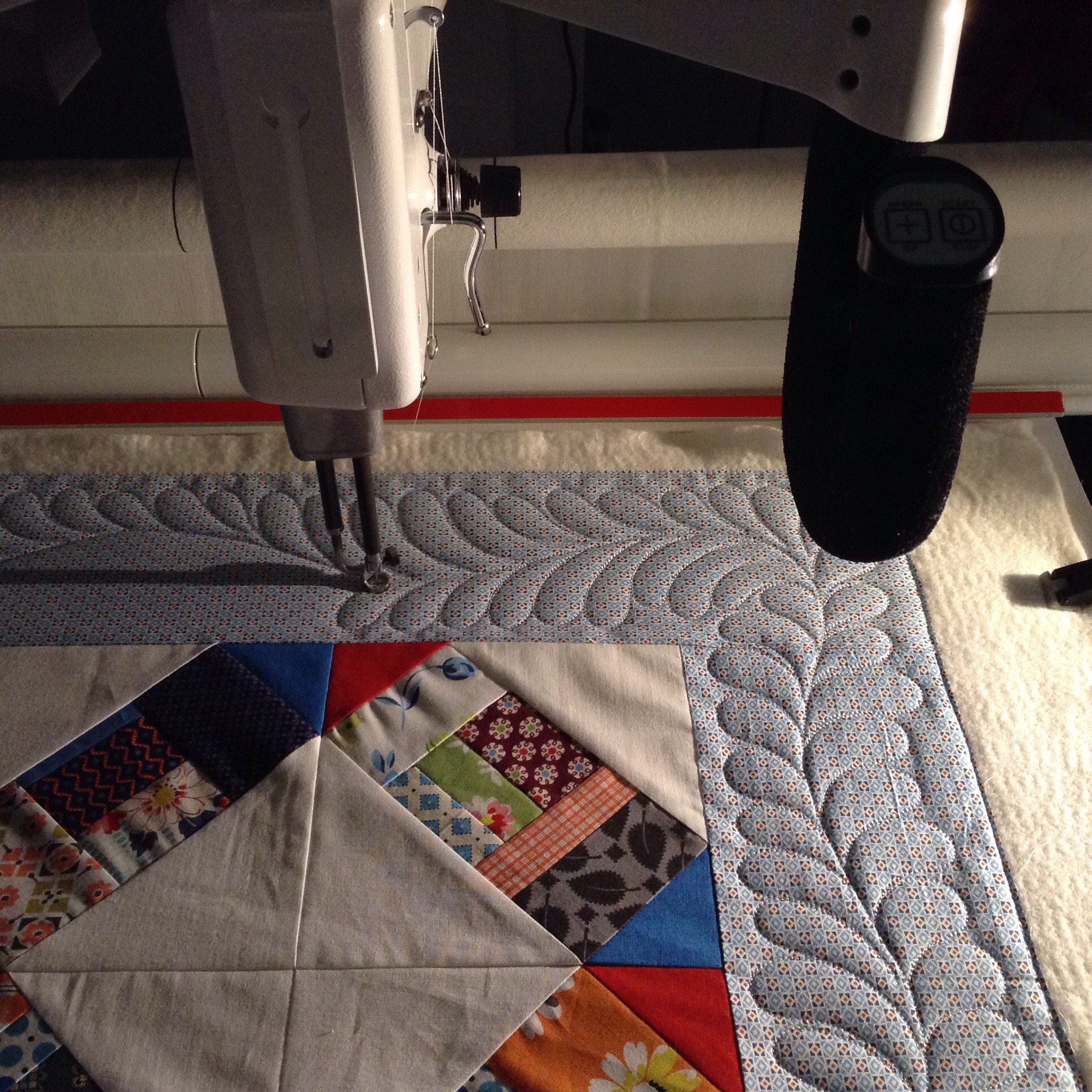 I decided to do a freehand feather in the border but I was having a terrible time seeing where I was going! I ended up getting a desk lamp to sidelight the quilt and turning the room lights off.