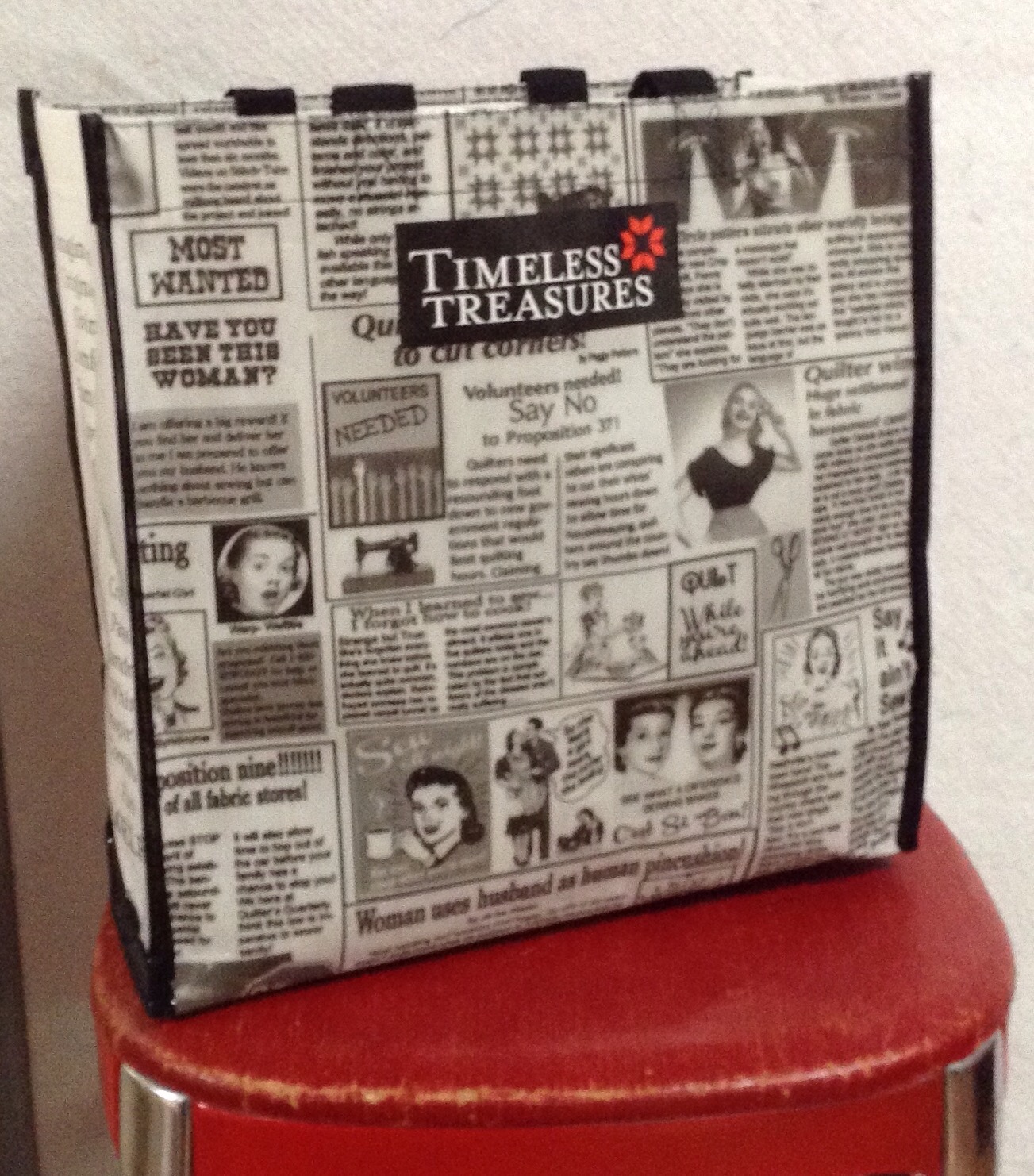 I also found this fun shopping bag with newspaper “articles” about quilters.