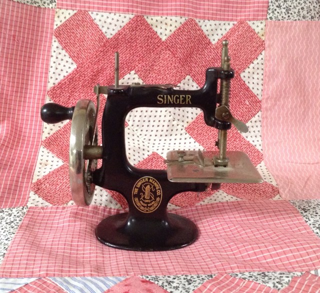 What an adorable little machine. I just love that pink and brown quilt. I’m not much into pink, but that shade when combined with brown certainly appeals to me.