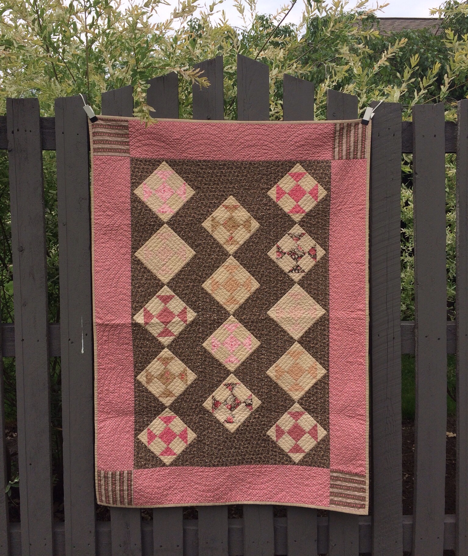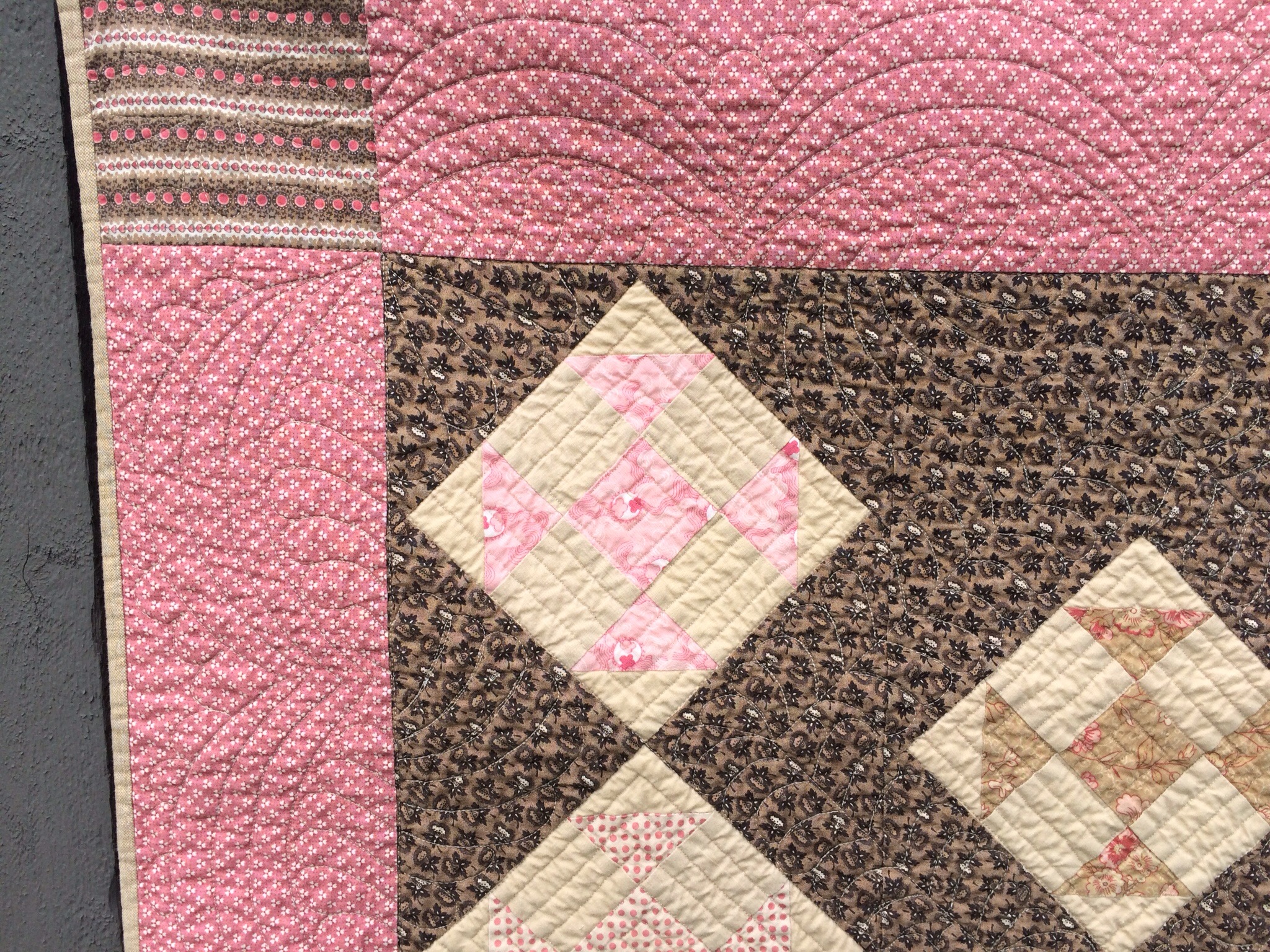 BTW, that pink quilt top was purchased at a local antique fair a few years ago. I am generally not a pink girl, but I do love old double pink fabrics. In fact, here is a pink and brown quilt I made about ten years ago.