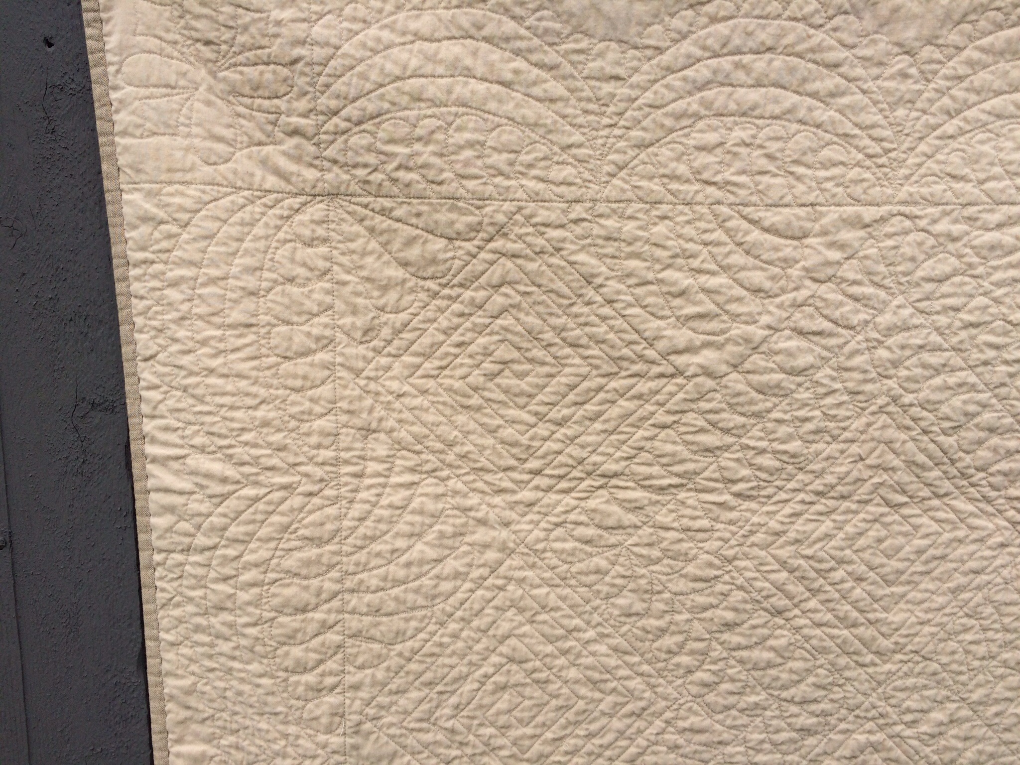 I quilted this on the Bernina 155 that I had at the time. I had purchased it used with money I had earned working tax season that year. I had always heard how great these were for free motion quilting. This was the first (only?) quilt that I free motion quilted on it. Frankly, it wasn’t any better than my 1955 Singer 201 for free motion work. I did use that machine for straight line quilting until I bought an older Bernina, my 1030. The 155 ended up doing closet time until I sold it last year. More expensive machines are not necessarily better.