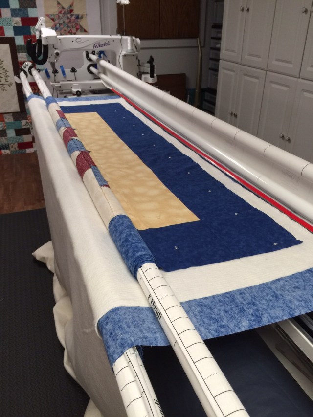 Not so interesting to look at right now! I want to get these finished before work today so I can get back to more quilty projects. Like this Quilt of Valor for the Stitching Sisters group. You can’t tell, but this is a Carpenter’s Star on the frame.