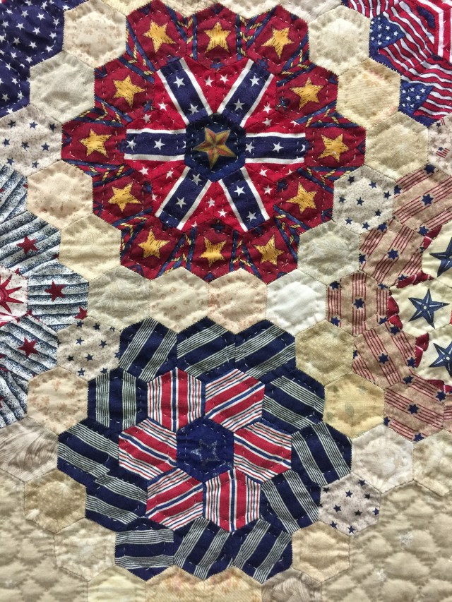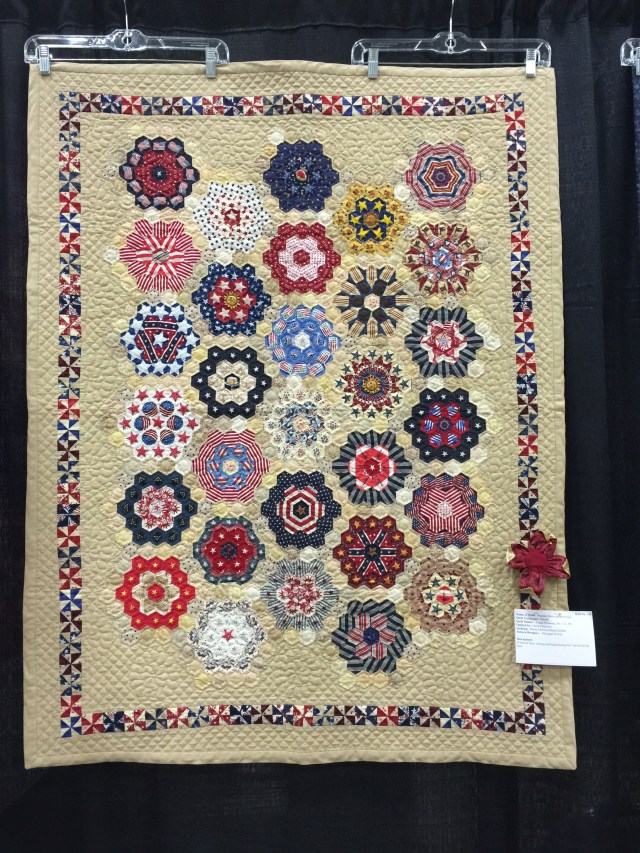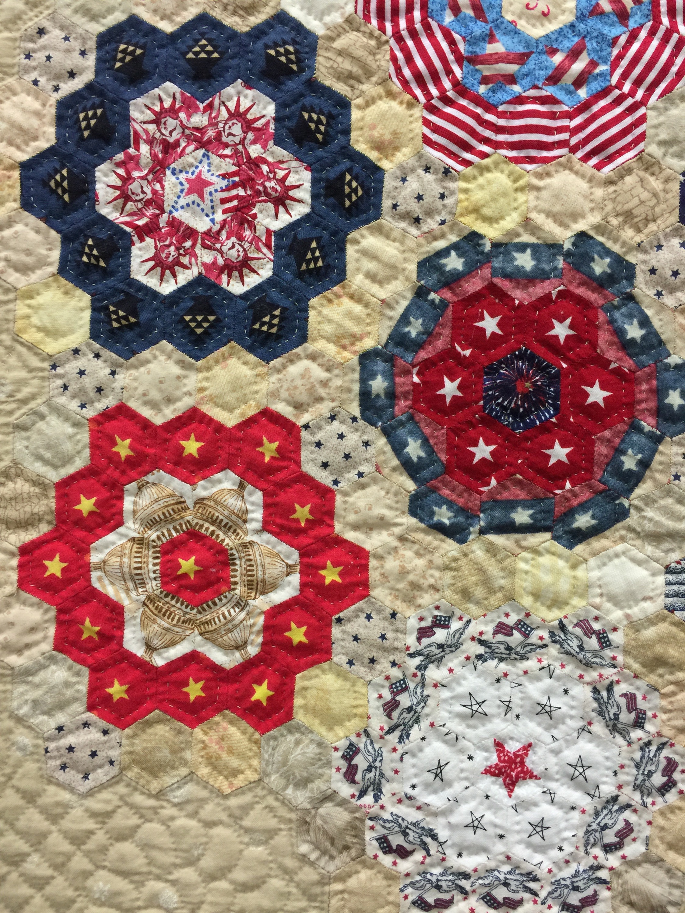 Love the red, white & blue hexie quilt! Makes me want to switch from 30’s retro fabrics and make one of those. I saved the pictures to my Pinterest account.