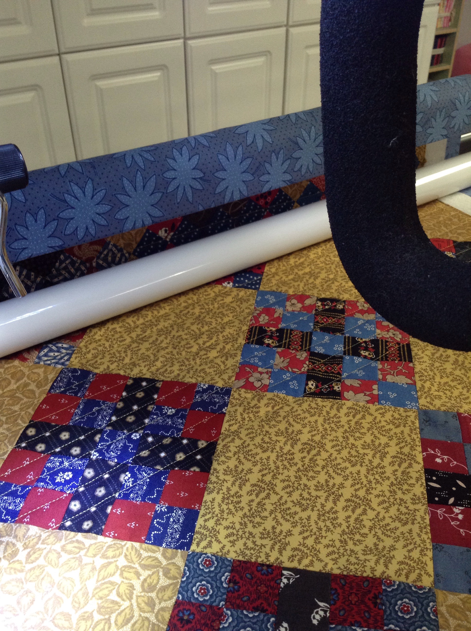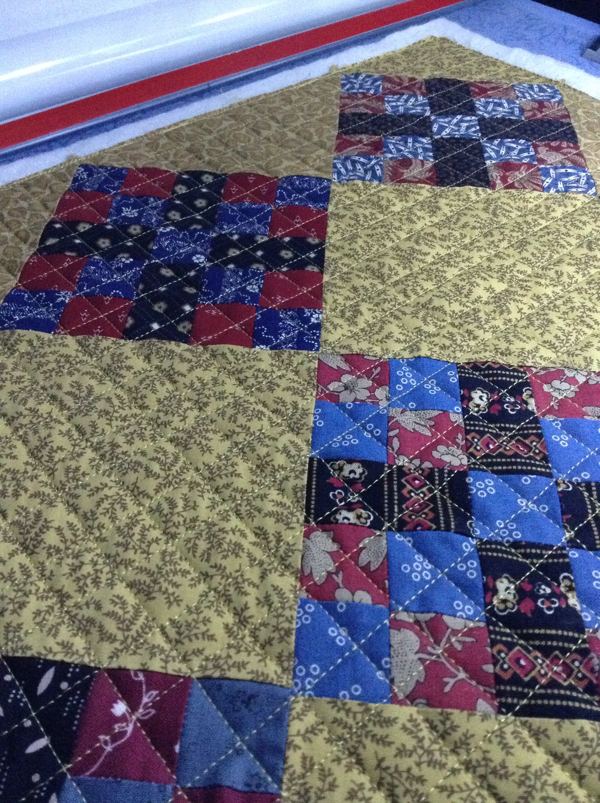 Yep, back to my stand by grid quilting. I did the lines freehand and I didn’t try very hard to hit the borders of the blocks. It is a humble quilt, after all. After doing the lines one way, I took the quilt off the frame and reloaded it to quilt the lines in the other direction.