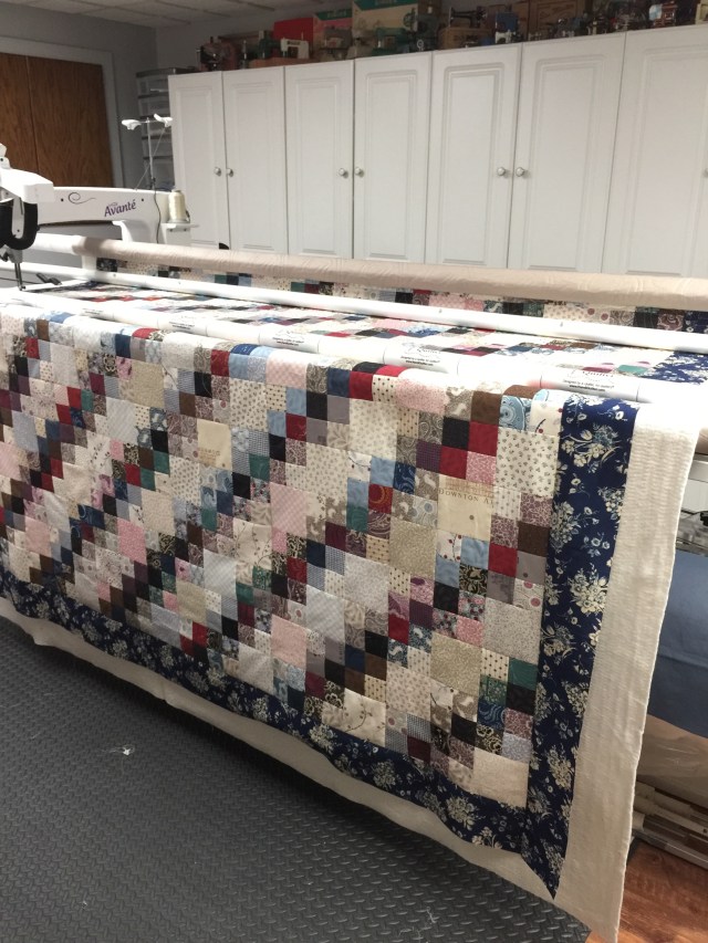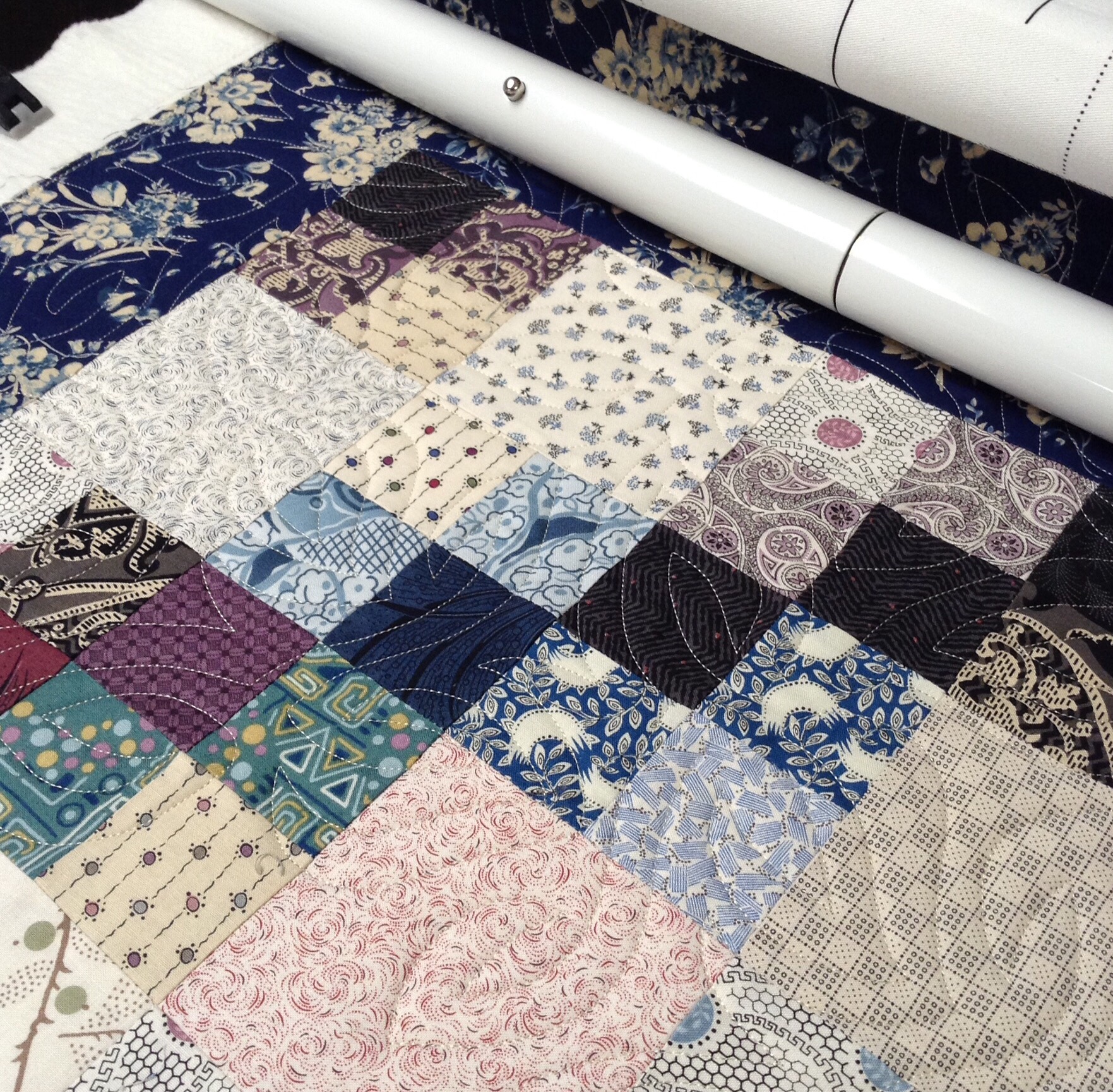 Are you tired of Downton yet? It is finally on the frame and quilting has commenced! Pretty much everyone was in agreement that the large blue floral was the right border choice. I couldn’t agree more!