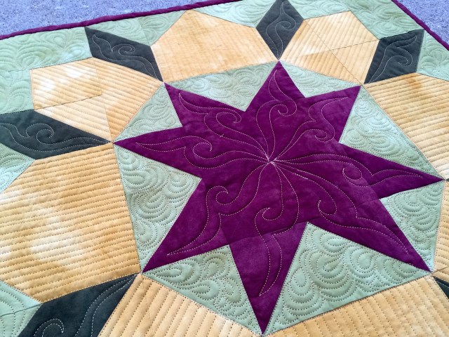 I just love your table topper. The quilting is just spectacular! And those fabrics are delicious! And while they’re solids, they certainly have a depth and movement that standard solids just don’t.