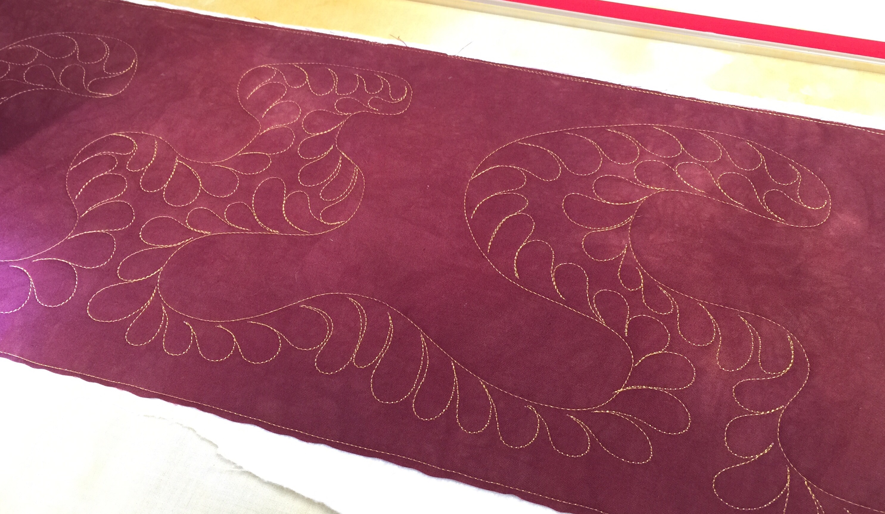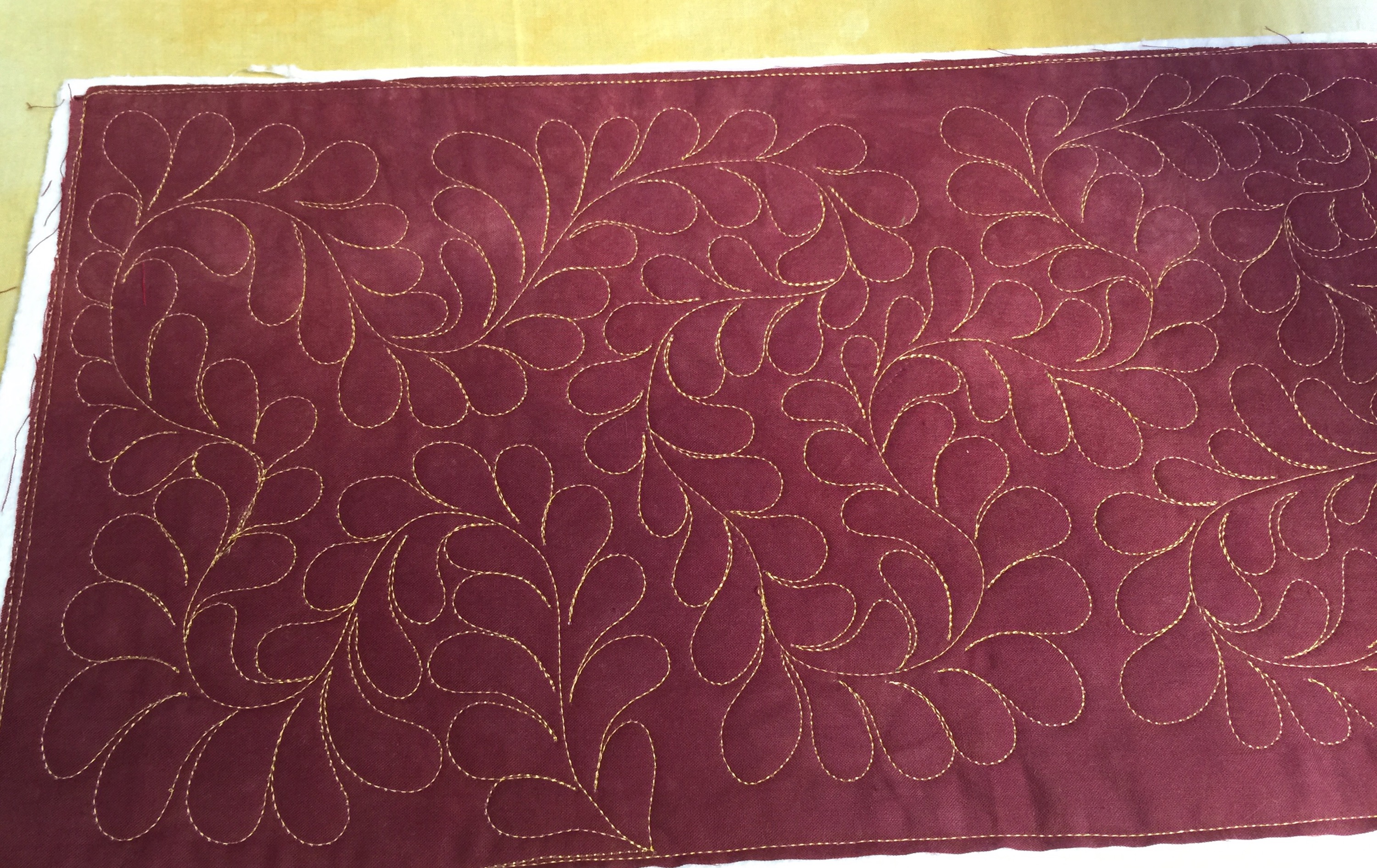 I am thinking about making some more. Maybe I will make zipper bags next. I’m not sure but I quilted up another piece of my hand dyed fabric to use. I wanted a wandering feather so I quilted a large squiggle across the piece. Then I went back and added feathers. First to one side: