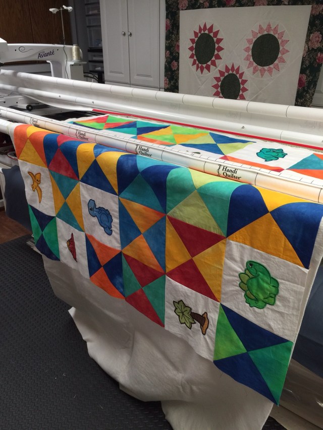 I finally have the dinosaur quilt top done and in the frame. I would like to get this quilted so I can do the binding while in Wisconsin.