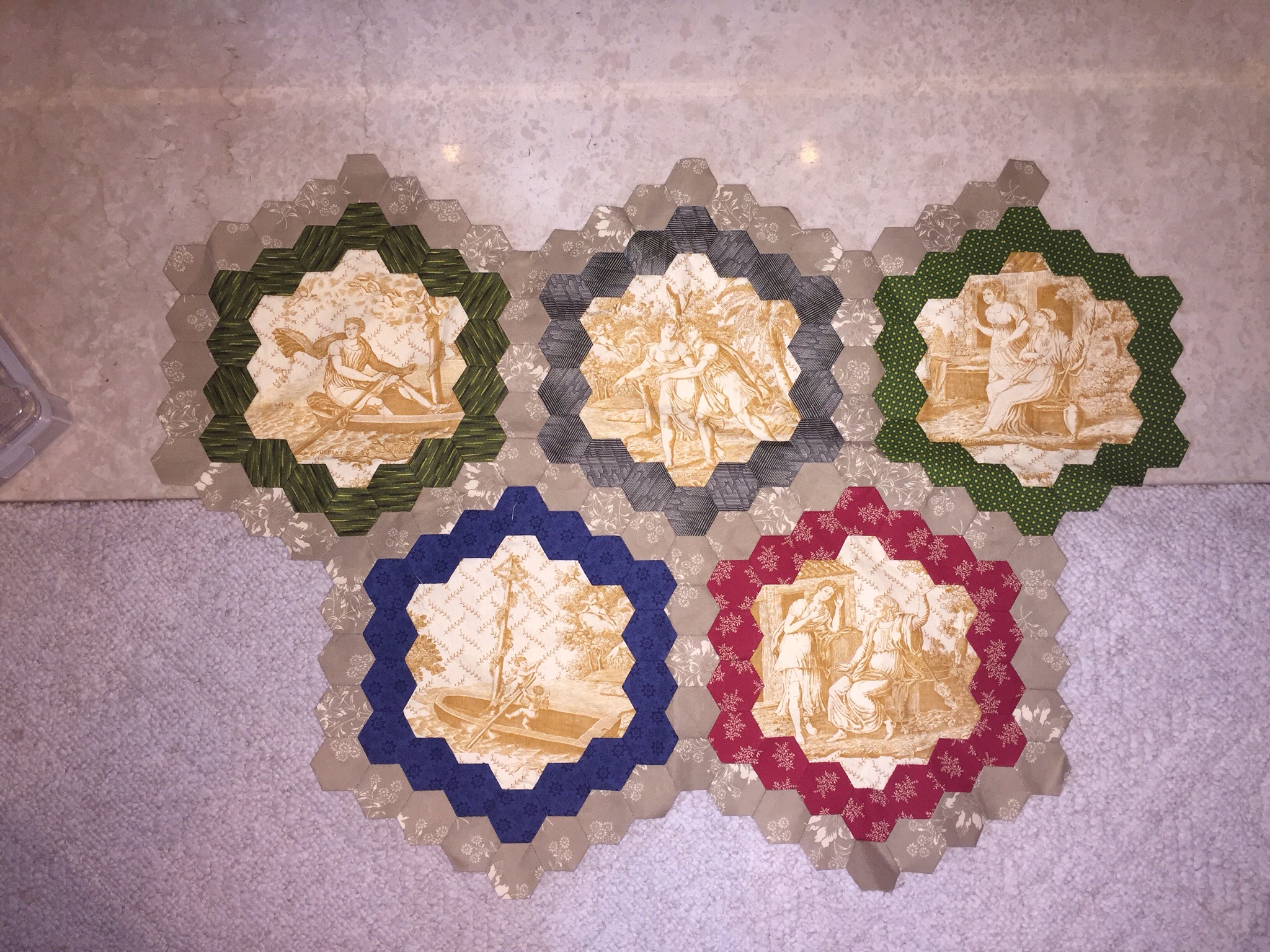That’s it. I added a couple to the center of my Brinton Hall quilt last night and hope to add another hexie medallion to it today.