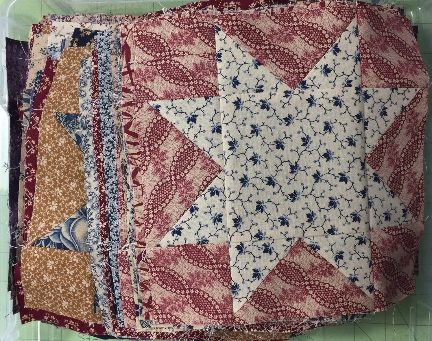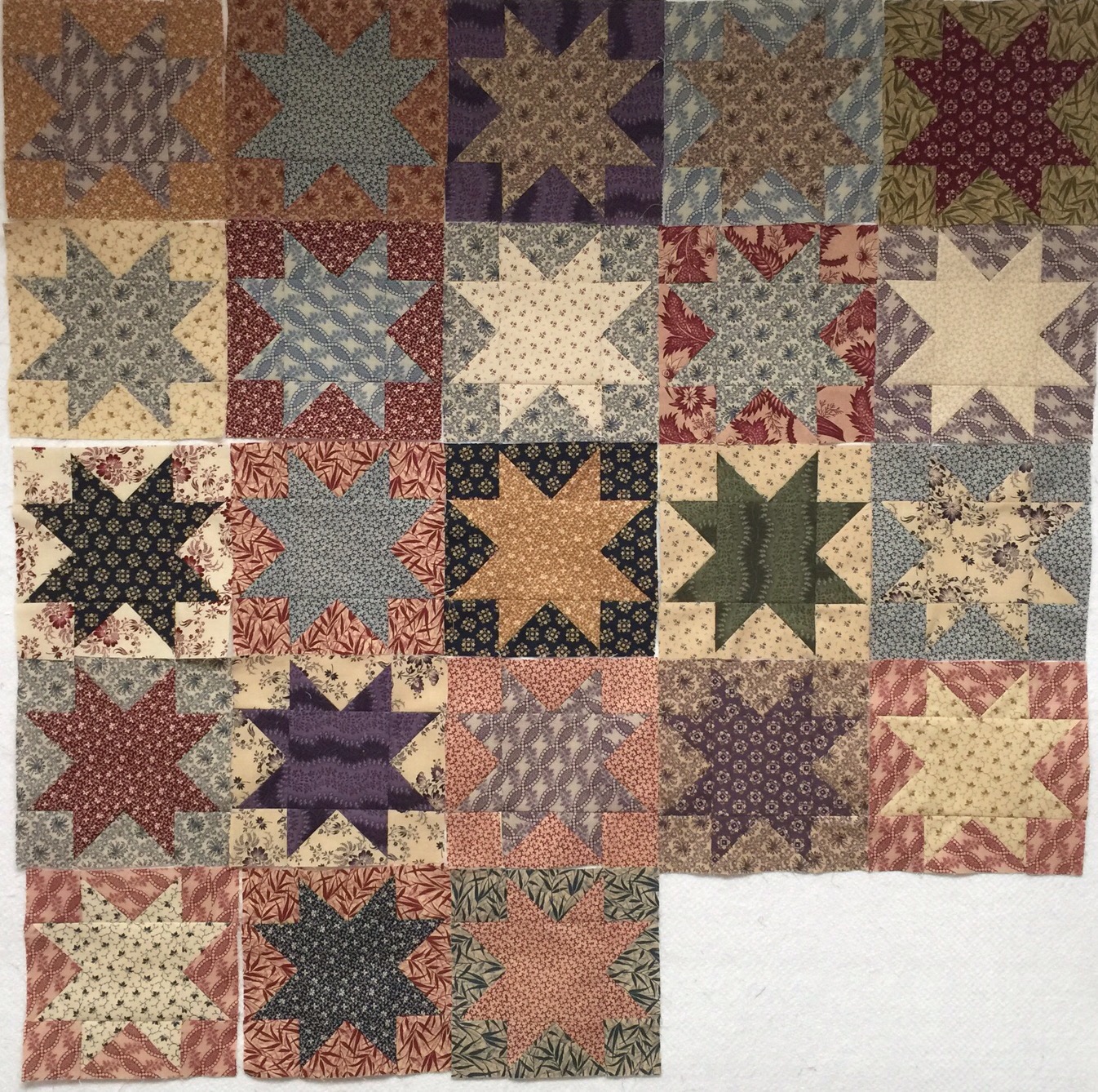 I cannot tell you how happy I am to say that my sawtooth star blocks are all done! Here are the last of them.