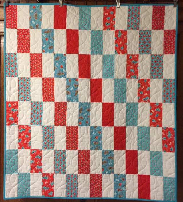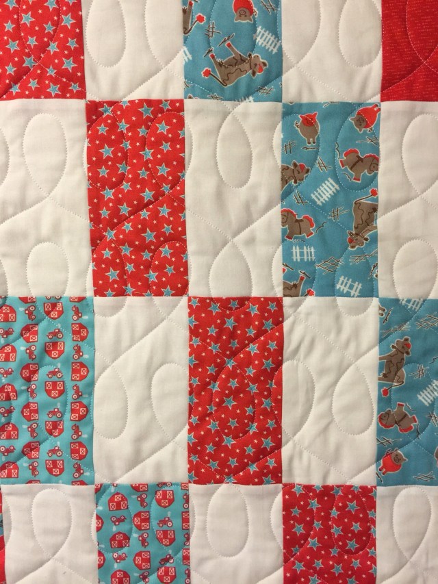 I like that you made the baby quilt with rectangles instead of square blocks – much more interesting. And your quilting adds a whimsical element to it.