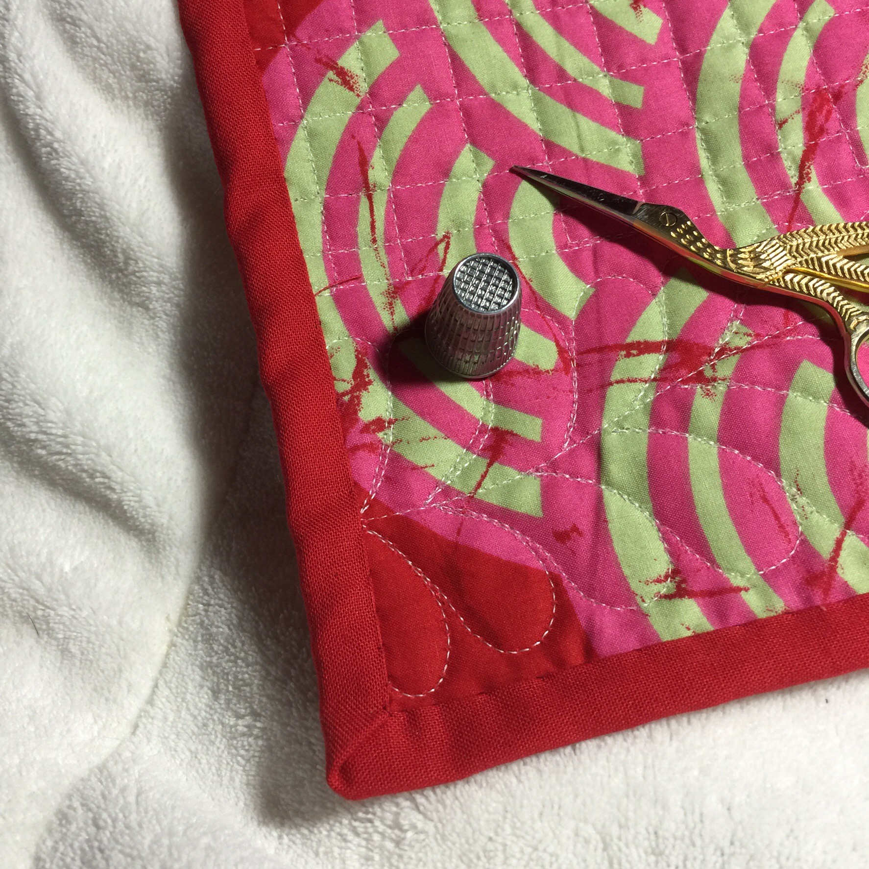Due to toddler chasing, snuggles on the run, visits to little brother etc. I’ve only managed to hand stitch a single length of thread on the binding of this little quilt that I finished on Thursday.
