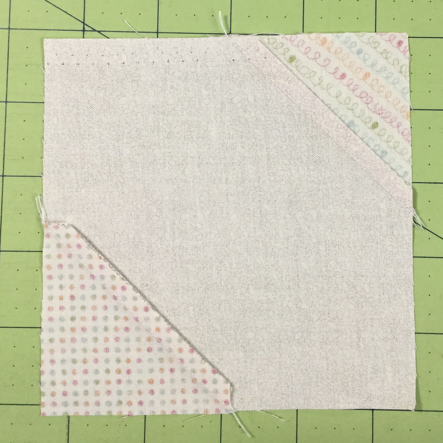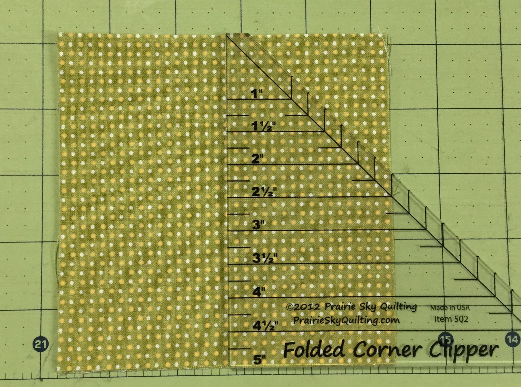 I cut my triangles to finish at 2 inches. With the corners nipped, this can be done with a 2 1/2 inch strip. So I place this tool on the square so that the top edge and the 2 1/2 inch marks are aligned with the sides of the square.