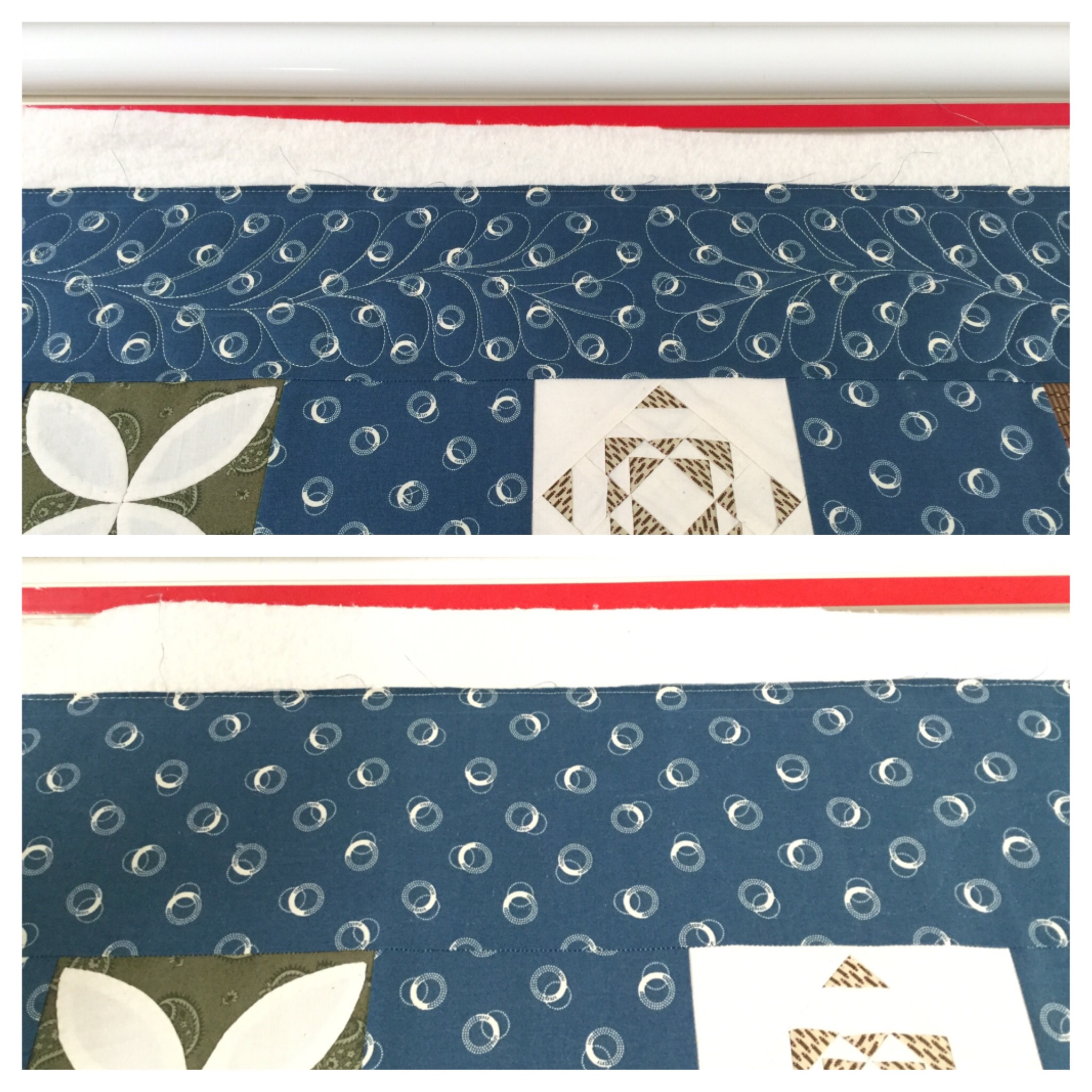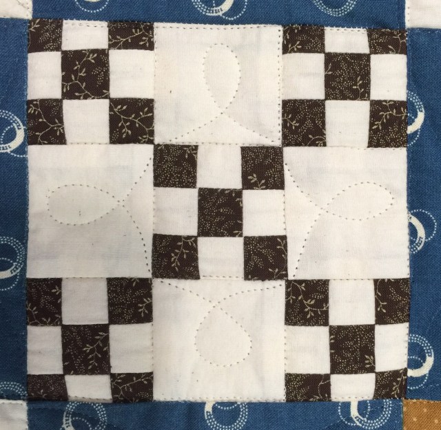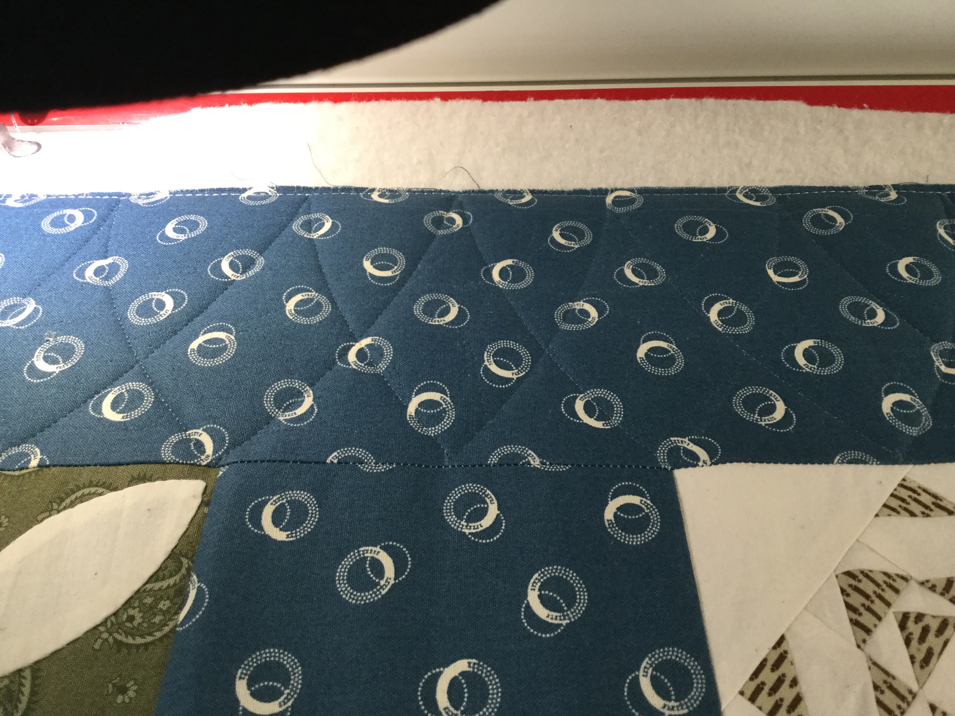 Um…yeah. Granted those little brown squares are only a half inch but goodness, some are practically disappearing! And how about that stitch not quite in the ditch?