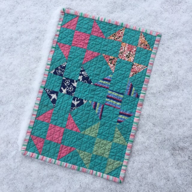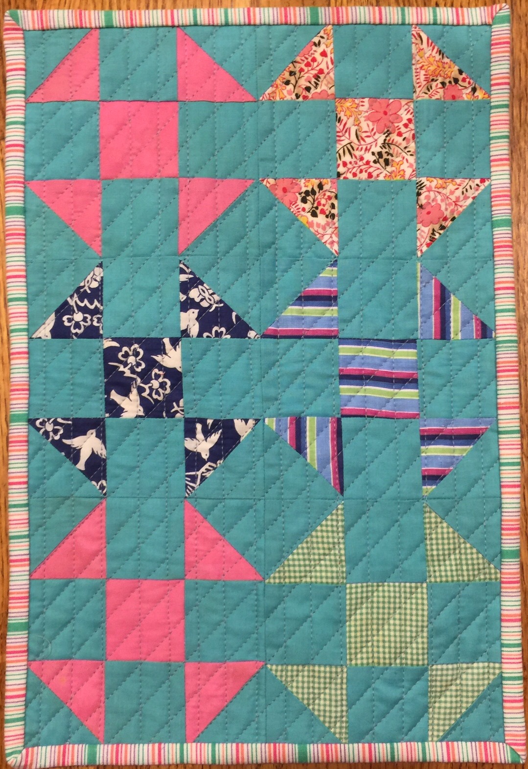I finished the little shoo fly quilt that I shared last week. I machine quilted it with a hanging diamond pattern. I think that background really makes it look modern!