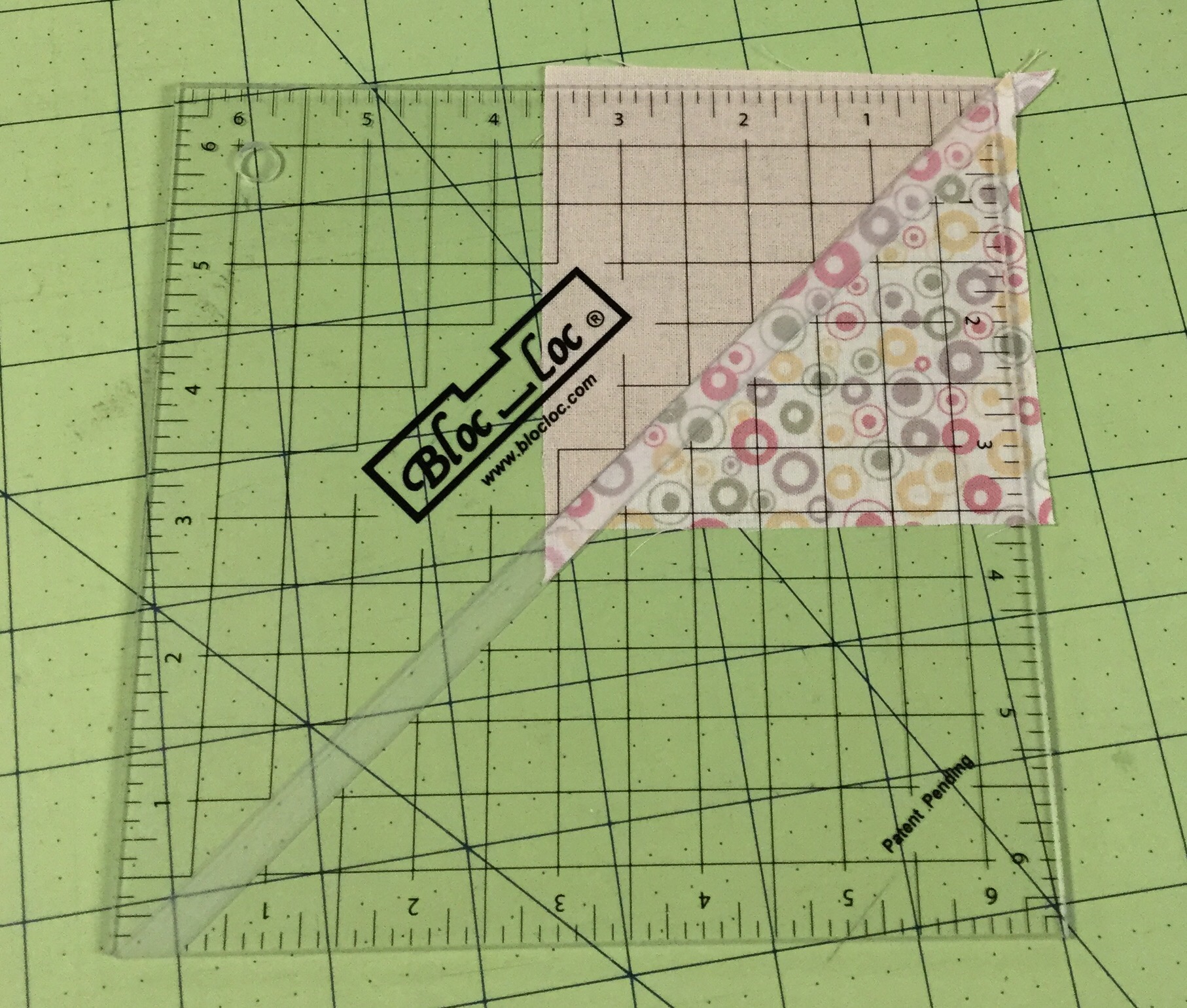 I’m squaring up the bonus triangles to 3 1/2 inches with this block lock ruler. It is awesome for this! You trim two sides and then flip the ruler and square to trim the other two sides.