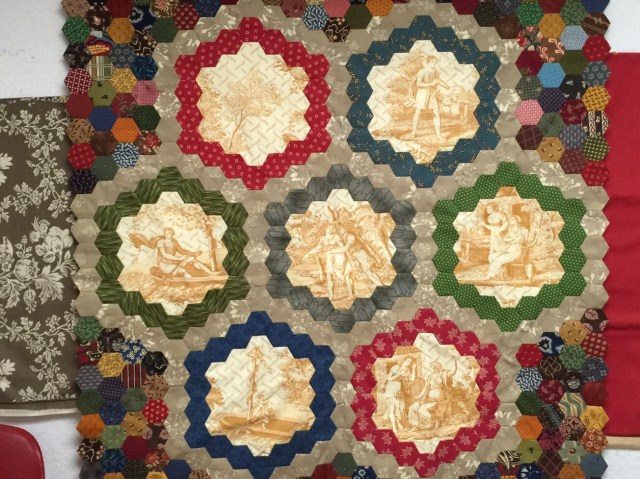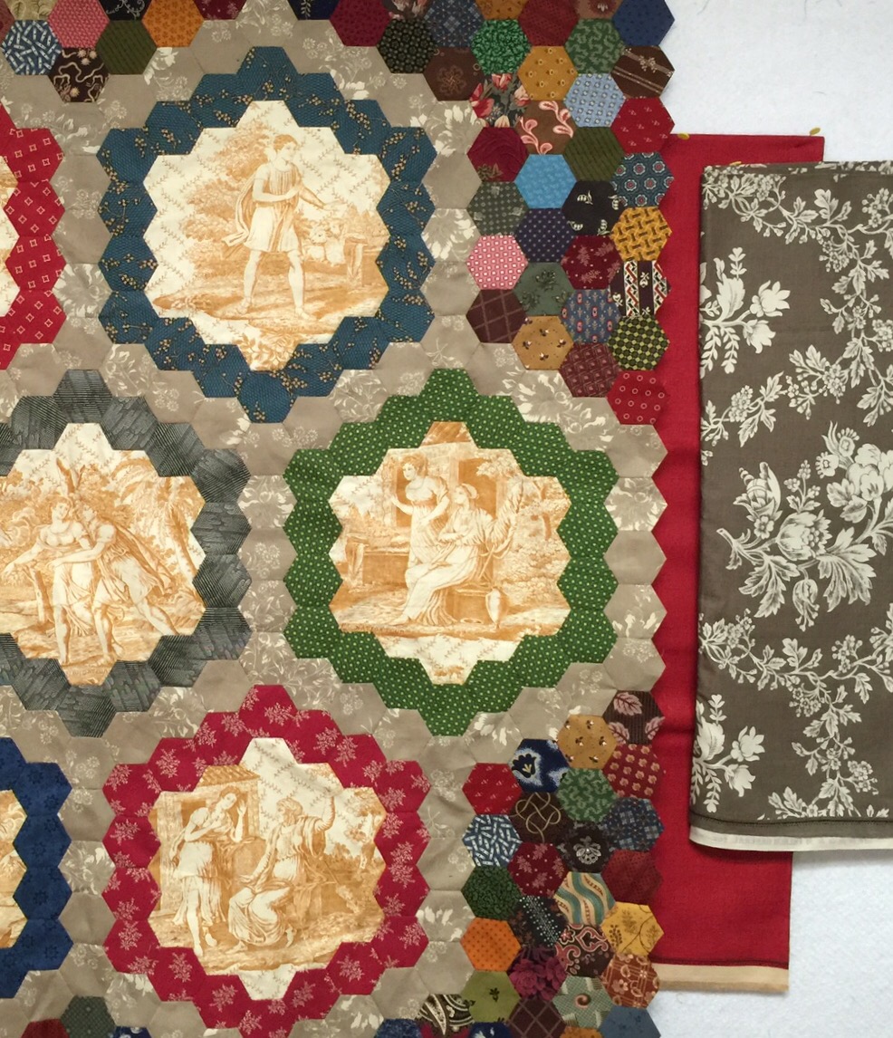 This looks terrific. I like the red with the border floral you picked. I think that taupe goes great with the row of hexies that are a similar, but lighter color. Have fun figuring out the borders and getting this one done.