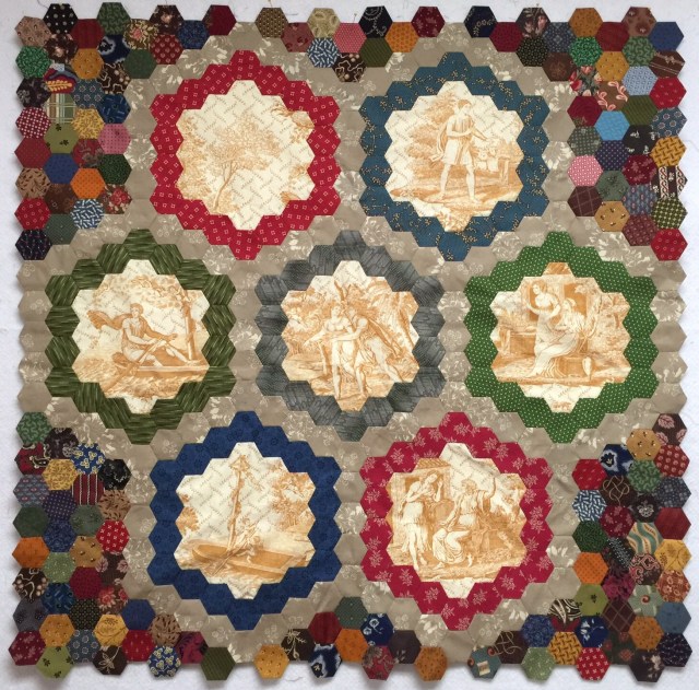I like your plan for one more round of hexies, then the narrow red border followed by the floral. It’s going to be gorgeous.