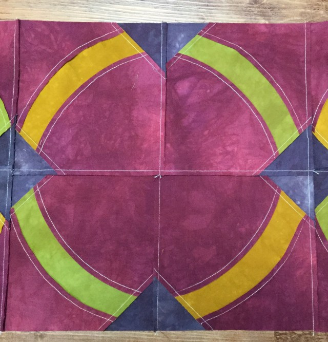 Wow! Curved piecing! Great to find a ruler that works. Really like the pattern and the lovely effects produced by the hand dyed fabrics.