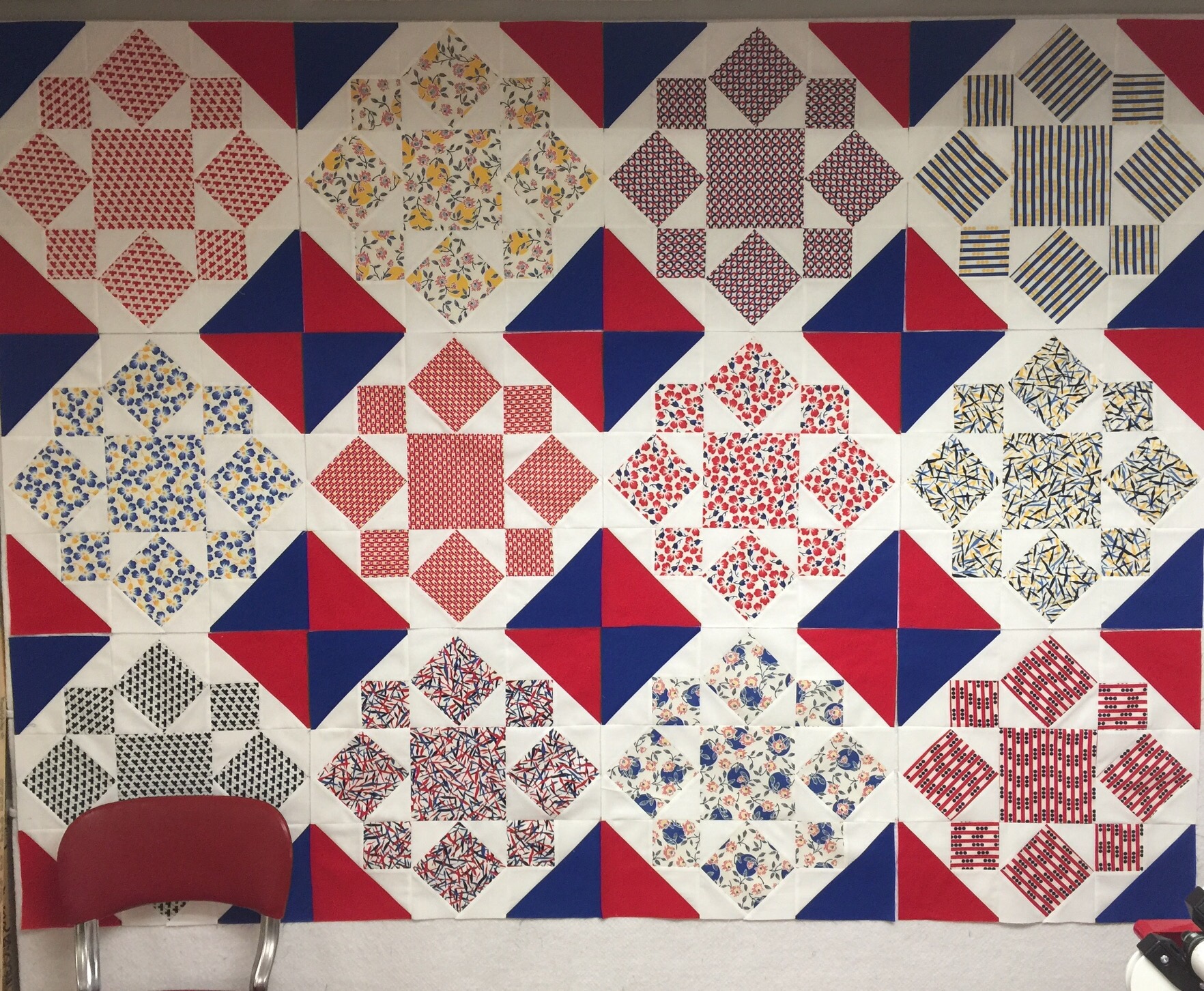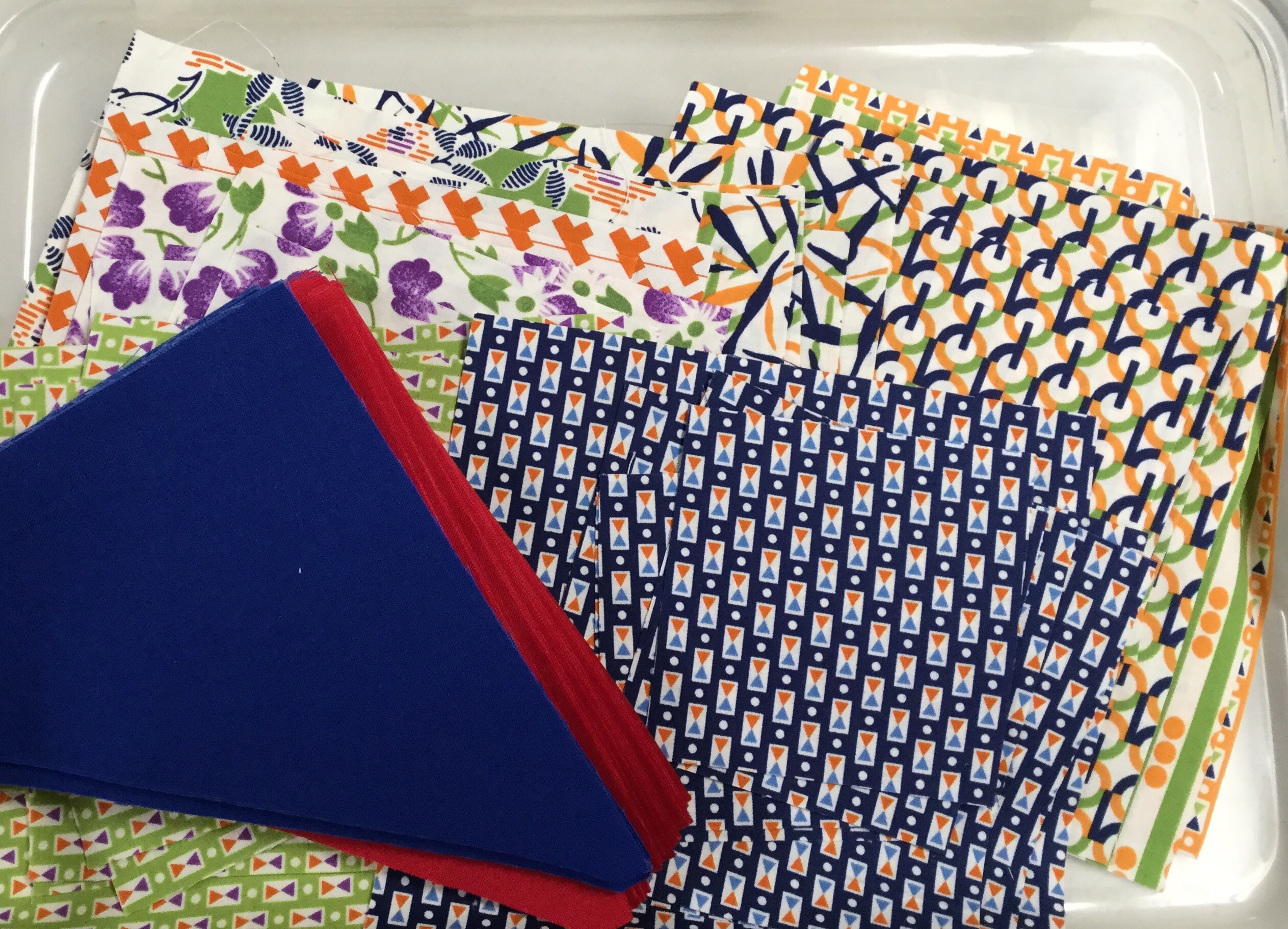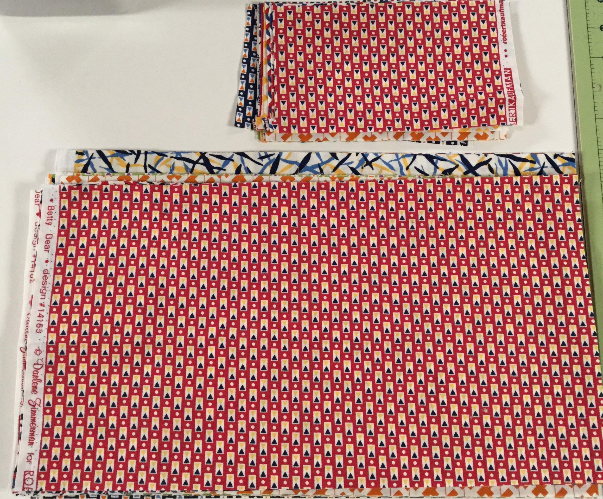 What a great retro design! Actually, I’ll bet the red and blue corners would work with all the fabrics because the eye sees the corners as “frames” and then the miscellany of the prints.