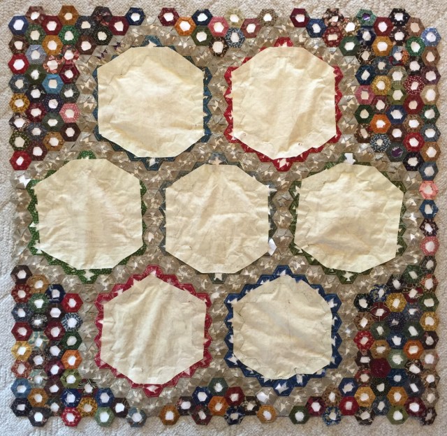 Just for fun, here is a picture of the back. A few of the paper hexies have fallen out but most are still in there.