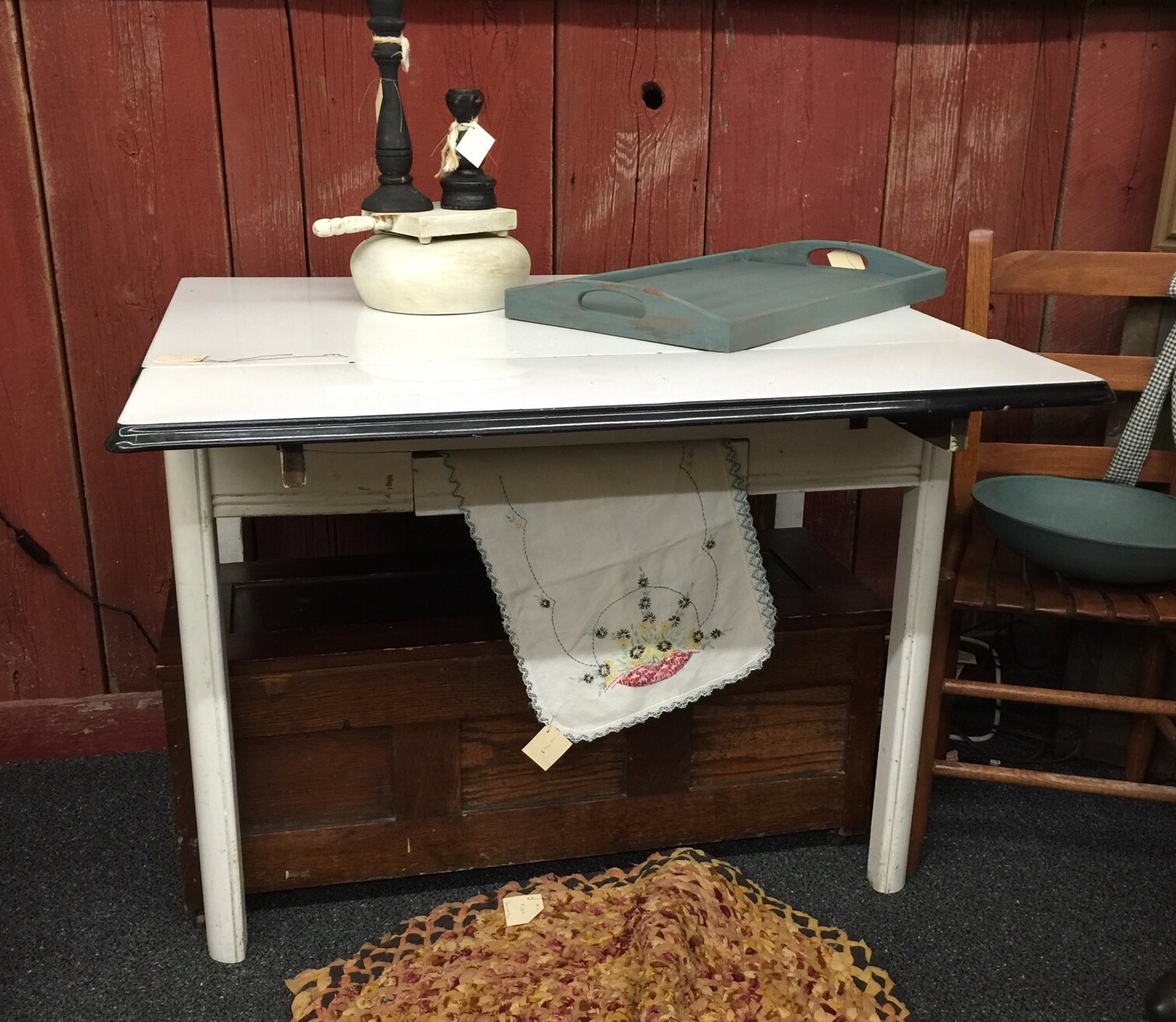 Yes, I know I have three enamel tables already. One has a machine on it where I do all my piecing, one holds my die cutter, and the third is employed as my desk. For as big as my sewing room is, my cutting table is my only free work space so I am constantly shifting things from place to place. So I have been looking for another of these tables. I wanted it to have wooden legs, not the commonly found metal legs, and it had to have leaves that worked well. In the picture above you can see the front leaf is pulled out. I really wanted one with red trim. But I might go back for this. Decisions, decisions.